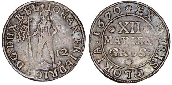 Obv: Wild men standing, facing left, holding a tree in left hand