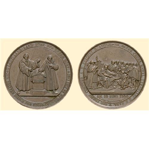 Bavarian, since 1805. Commemorative bronze medal 1830 (45mm, 43.46 g) for the 300 years Anniversary of the Confessio Augustana. Luther and Melanchthon at altar with book / Emperor Charles V receiving the declaration from the Saxonian ambassador on the diet in Augsburg.