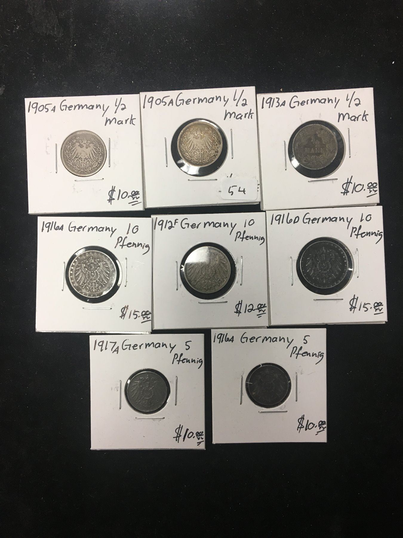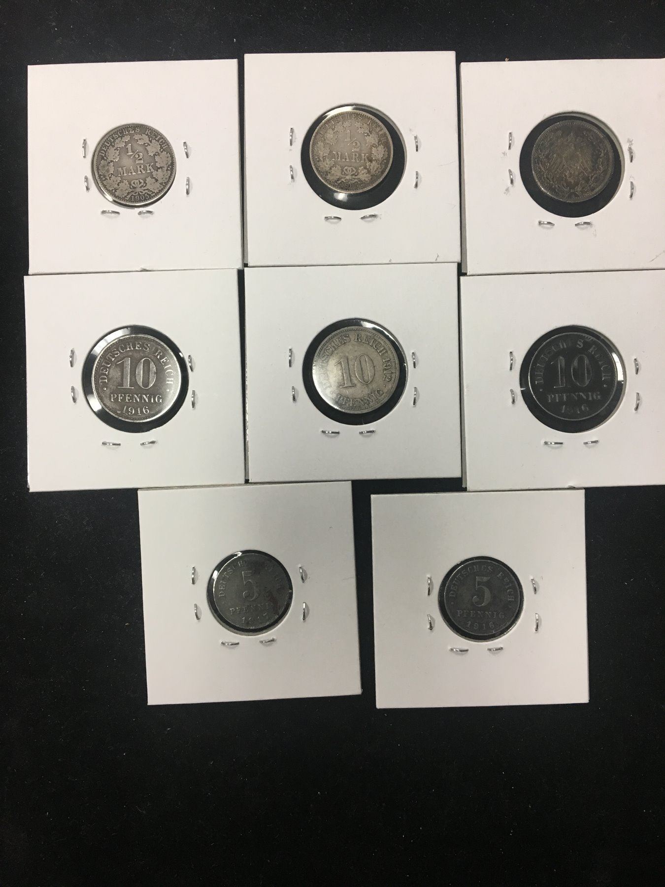 NICE LOT OF GERMAN COINS! 1905A 1/2 MARK X2,1913A 1/2 MARK,1912F 10 PFENNIG,,1916A 5 PFENNIG,1916A 10 PFENNIG,1916D 10 PFENNIG AND 1917A 5 PFENNIG.