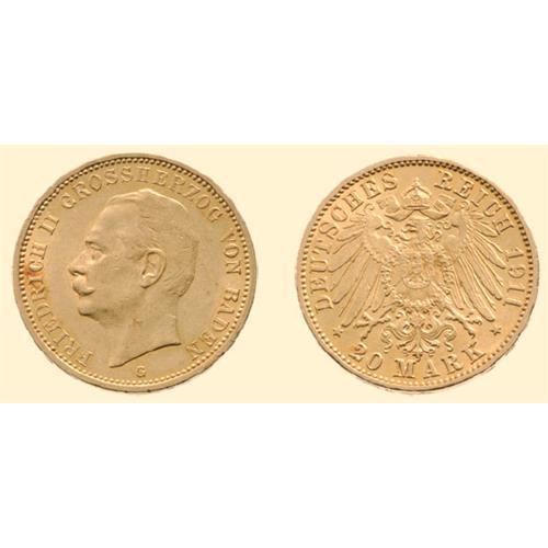 Frederic II, 1907-1918. 20 Marks 1911, Karlsruhe. J. 192; KM. 284; Fr. 3760.