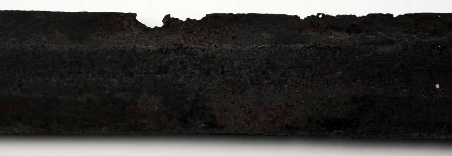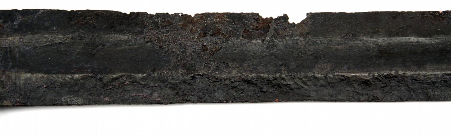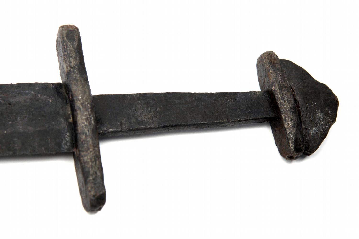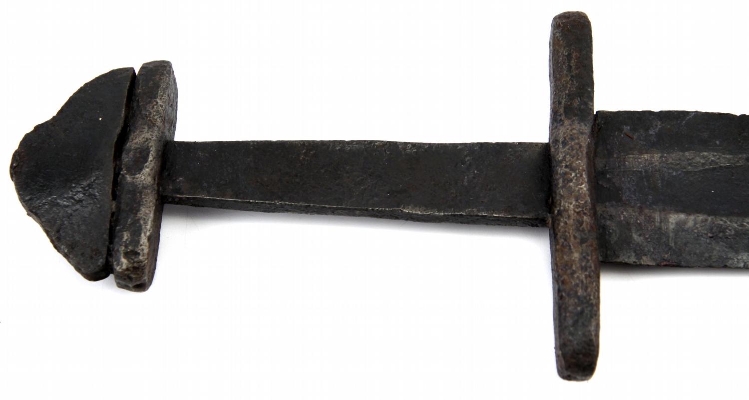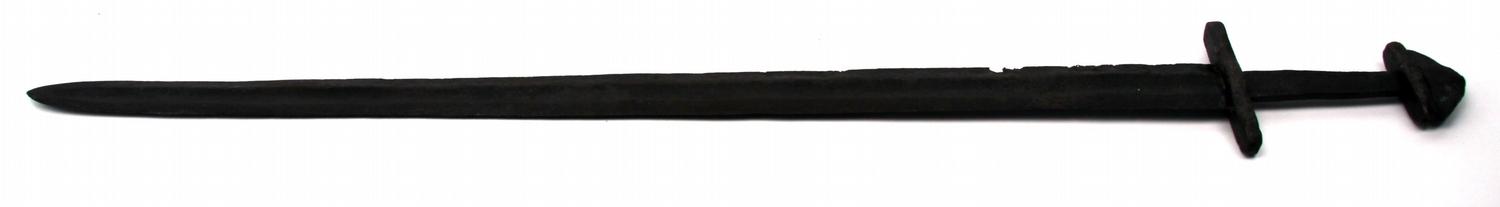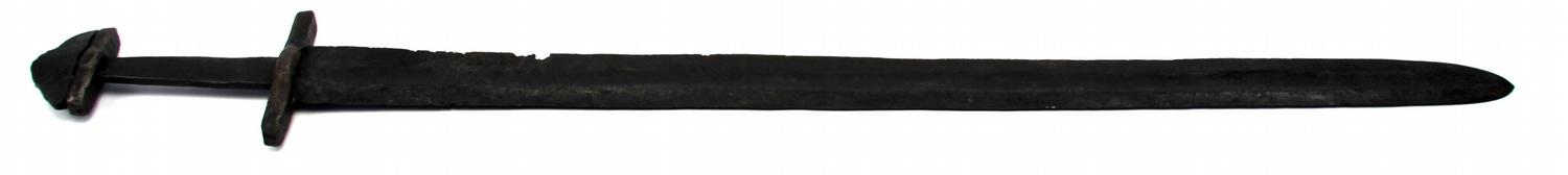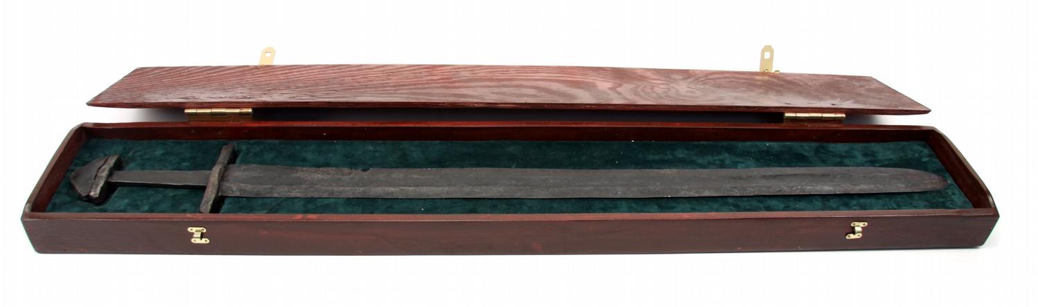 Double-edged blade, with full length fullers. Short flat quillons, with conical tang and mushroom pommel. Estimated to be approximately 1100 years old. Claimed to be excavated from a German forest. Blade measures 32 inches. In excavated, but well preserved condition in its full length, with good remaining matter. Wood display box included.