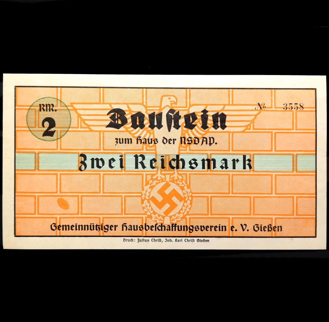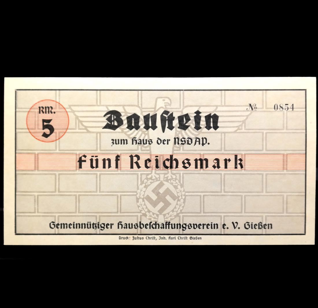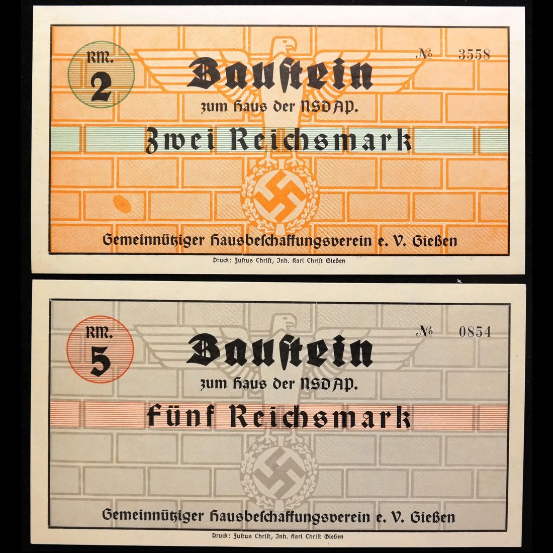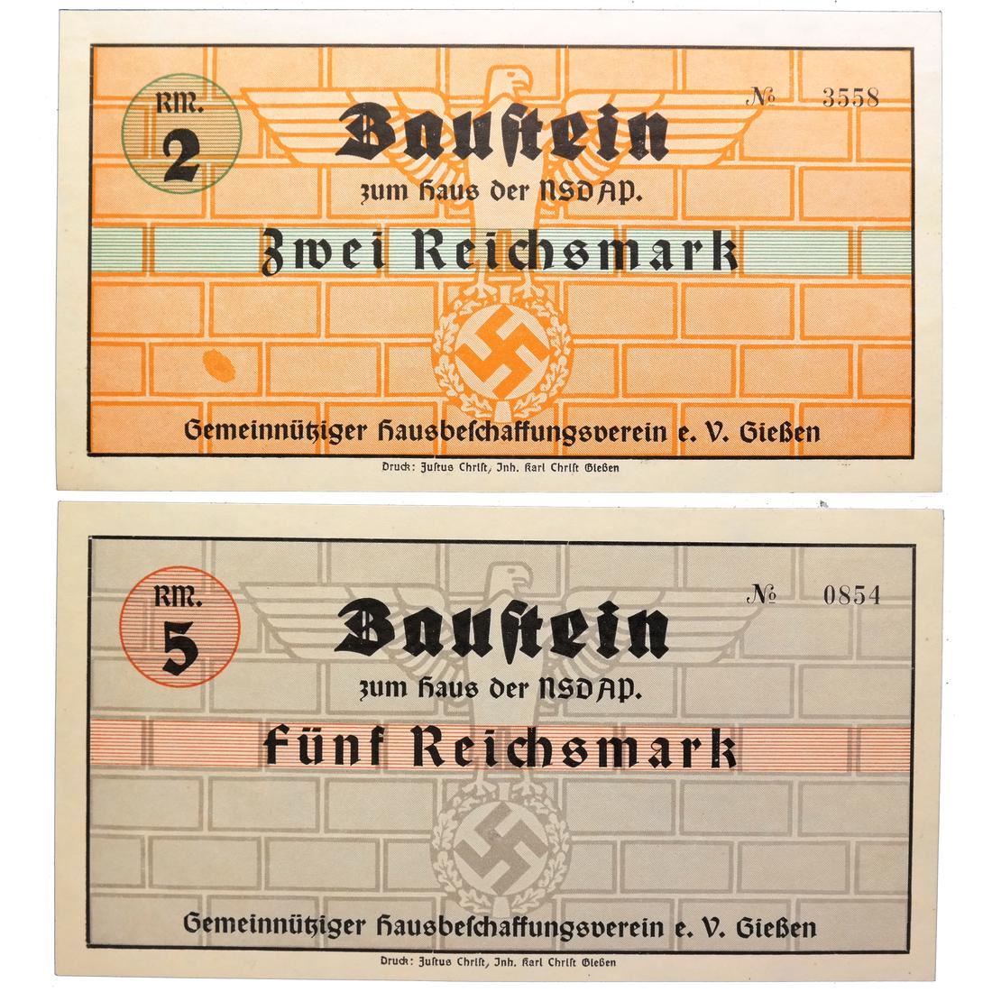 Gemeinntziger hausbeischaffungsverein e.V. Giessen 2RM and 5RM notes with serial numbers, Uncirculated.