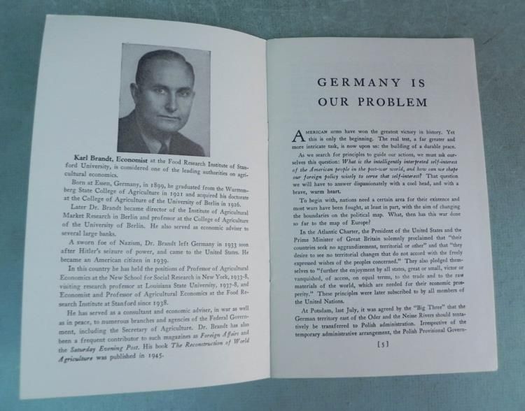 "GERMANY IS OUR PROBLEM" 1946 SC BOOK 18 PGS--INK STAMP INSIDE "AMERICAN RELIEF FOR GERMANY, INC-WISCONSIN BRANCH W/ADDRESS