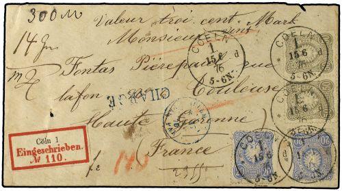 1876 Registered and charged envelope to France bearing 20 pf blue (2) (SG 34) and 50 pf grey black (pair) (SG 36) tied by COELN cds with matching registered label and handstruck CHARGE in blue with boxed accountancy on reverse and French entry cachet. Fine and scarce item.