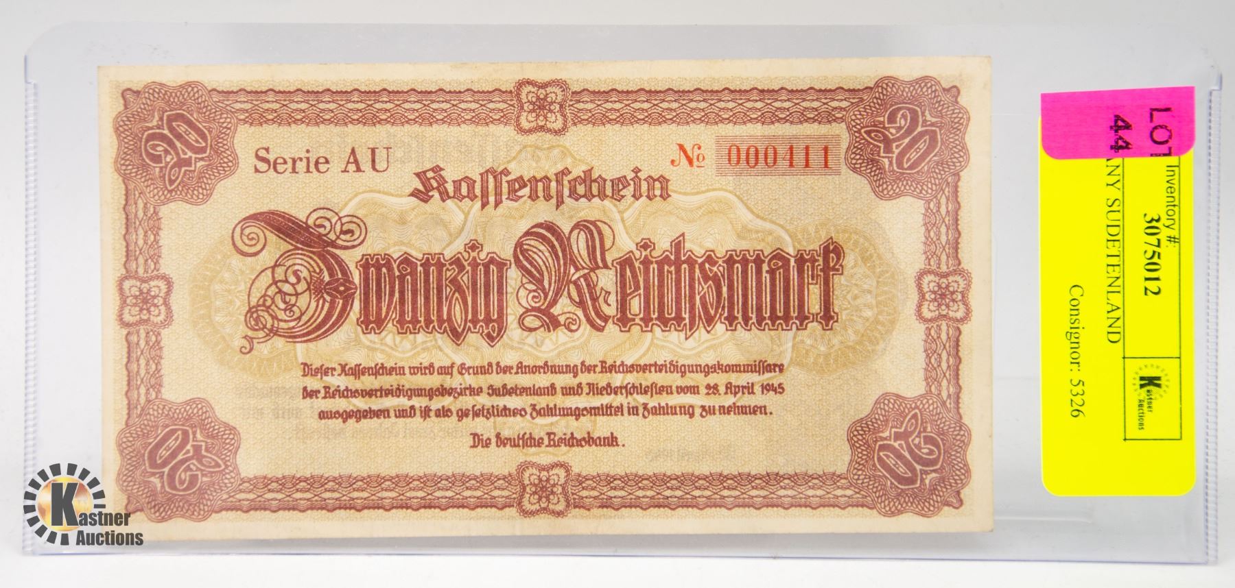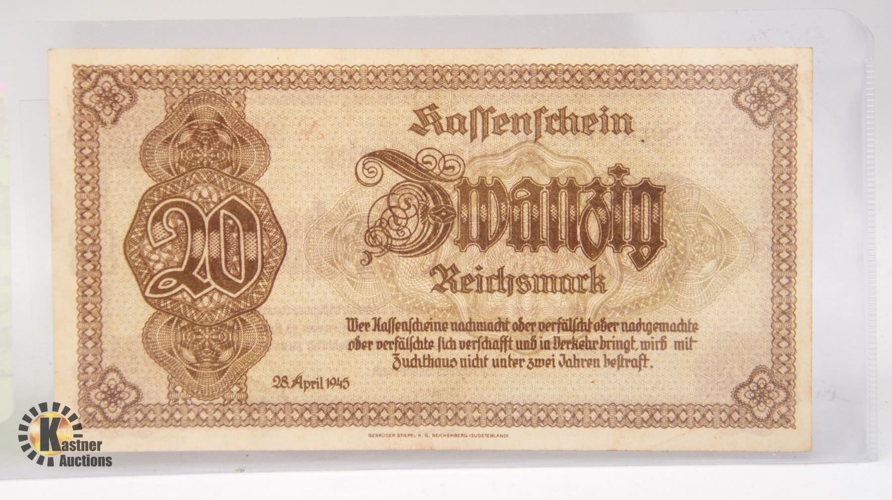 20 REICHSMARK 1945 (UNCIRCULATED) **ALL ITEMS MUST BE REMOVED BY 5PM SATURDAY, JUNE 17TH 2023. ALL REMAINING ITEMS WILL BE SUBJECT TO A $6.00 PER DAY STORAGE CHARGE. ANY ITEMS REMAINING AFTER MONDAY, JULY 3RD, 2023 WILL BE CONSIDERED FORFEITED. NO REFUNDS WILL BE ISSUED FOR FORFEITED ITEMS. TO SCHEDULE A PICK UP APPOINTMENT CLICK HERE