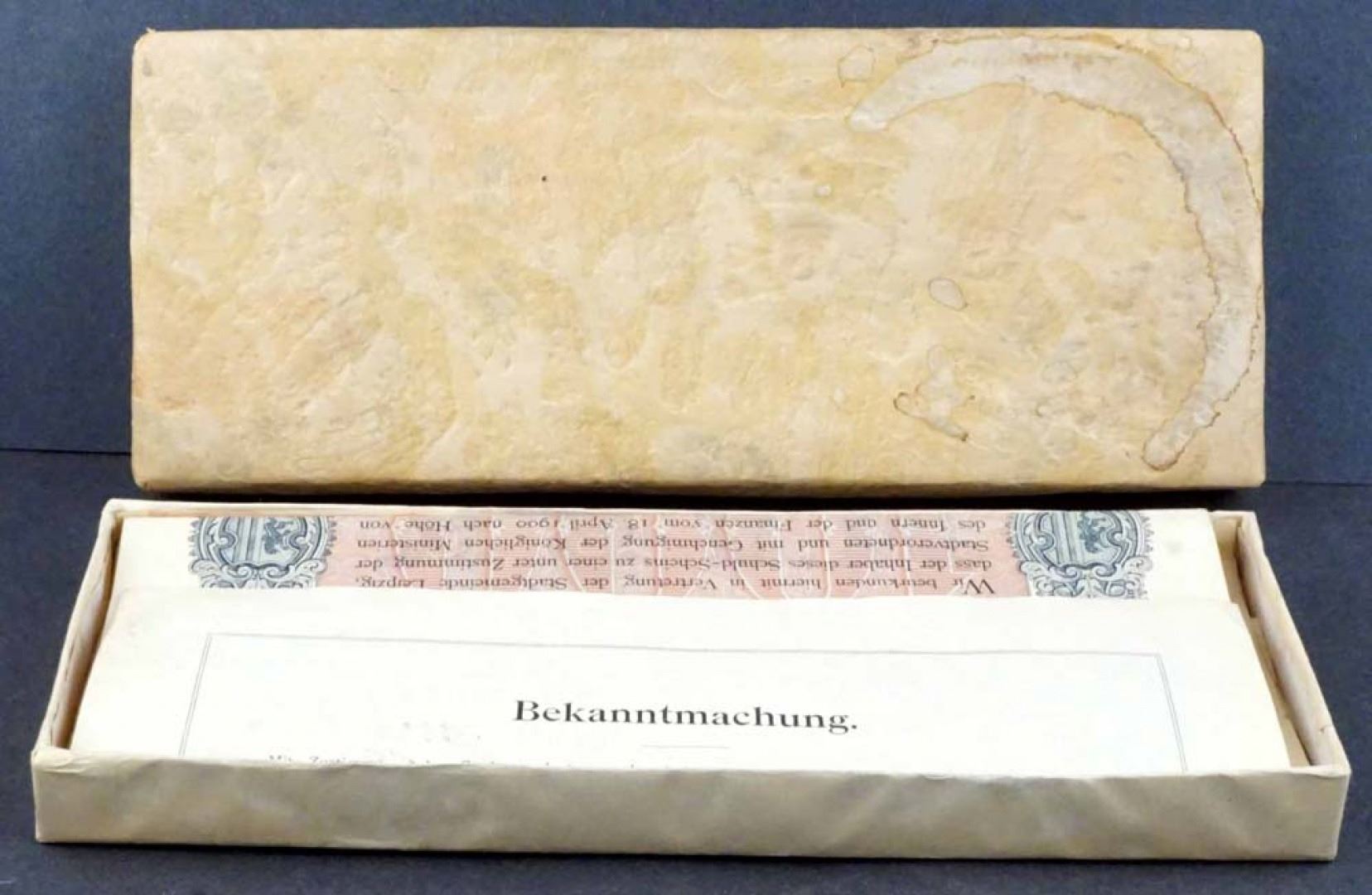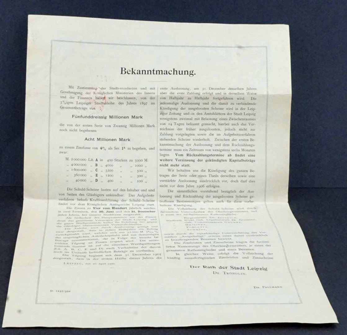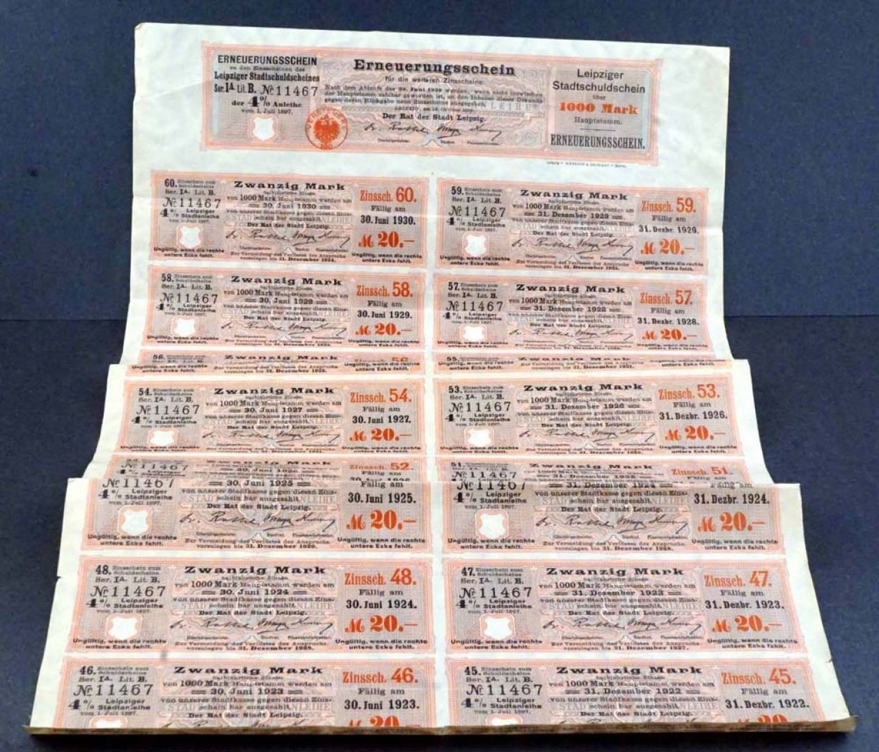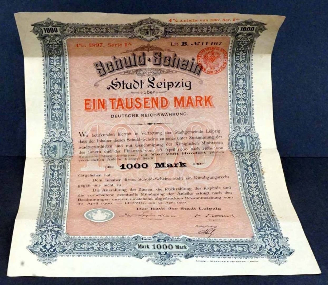 Bond in a Box - Germany - Schuld-Schein Stadt Leipzig 1900 Bond for 1000 Mark + Plus 16 Coupons Four coupons missing, most likely cashed. The next one due was Dec. 31, 1922, and by then 20 Mark was effectively worthless. The bond and the coupon sheet were folded to fit an old cardboard box, and this is how the lot is offered, as found.
