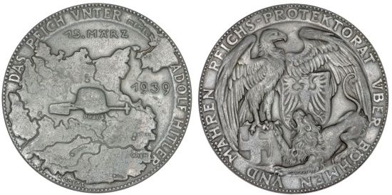 Obv: German eagle on swastika with wings outspread over symbols of Bohemia and Moravia;