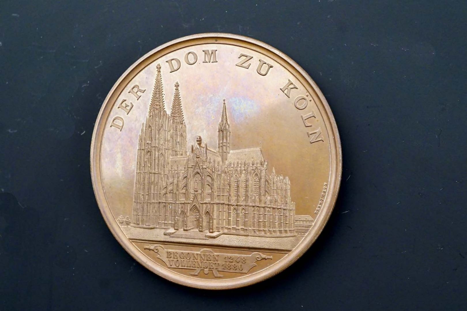 50 mm, 58.2 grams. Choice, glossy UNC. Light brown copper. Obverse: DER DOM ZU KÖLN The cathedral of Cologne. Below: BEGONNEN (began) 1248, VOLLENDET (completed) 1880. Signed: DRENTWETT. Reverse - above: Amber Tung Der hl. Drei Könige. Below: DOMBILD ZU KÖLN Mary, enthroned, facing, holding the baby Jesus. To left and right, the three Kings, two kneeling, with their courtiers behind. Undated, but probably issued to commemorate the completion of the Cathedral in 1880,