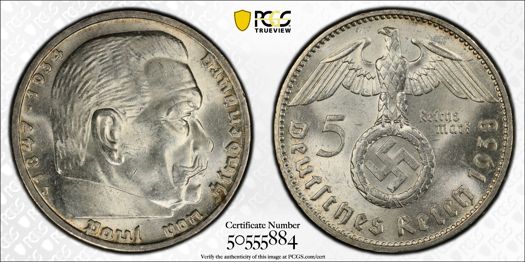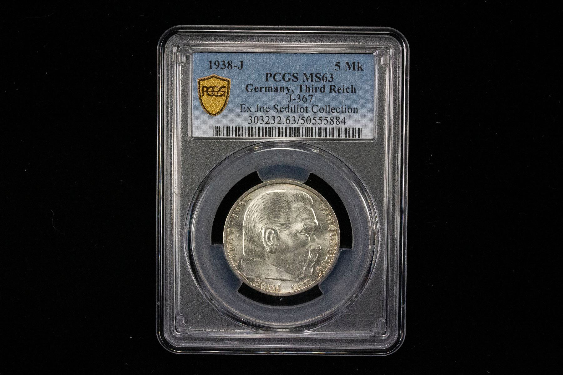 GERMANY: Third Reich, AR 5 reichsmark, 1938-J, KM-94, Y-97, J-367, Paul von Hindenburg, a lovely lustrous example! PCGS graded MS63, ex Joe Sedillot Collection.
