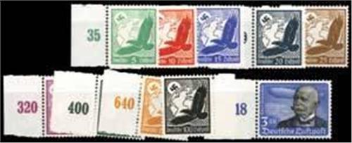 1934 Airmails 5pf to 3m excl 2m each with horiz ribbed gum (SG 526a-536a excl 535a) each being l/h marginal except for 100pf with has r/h margin, fine u/m cat £635/Mi 950euros