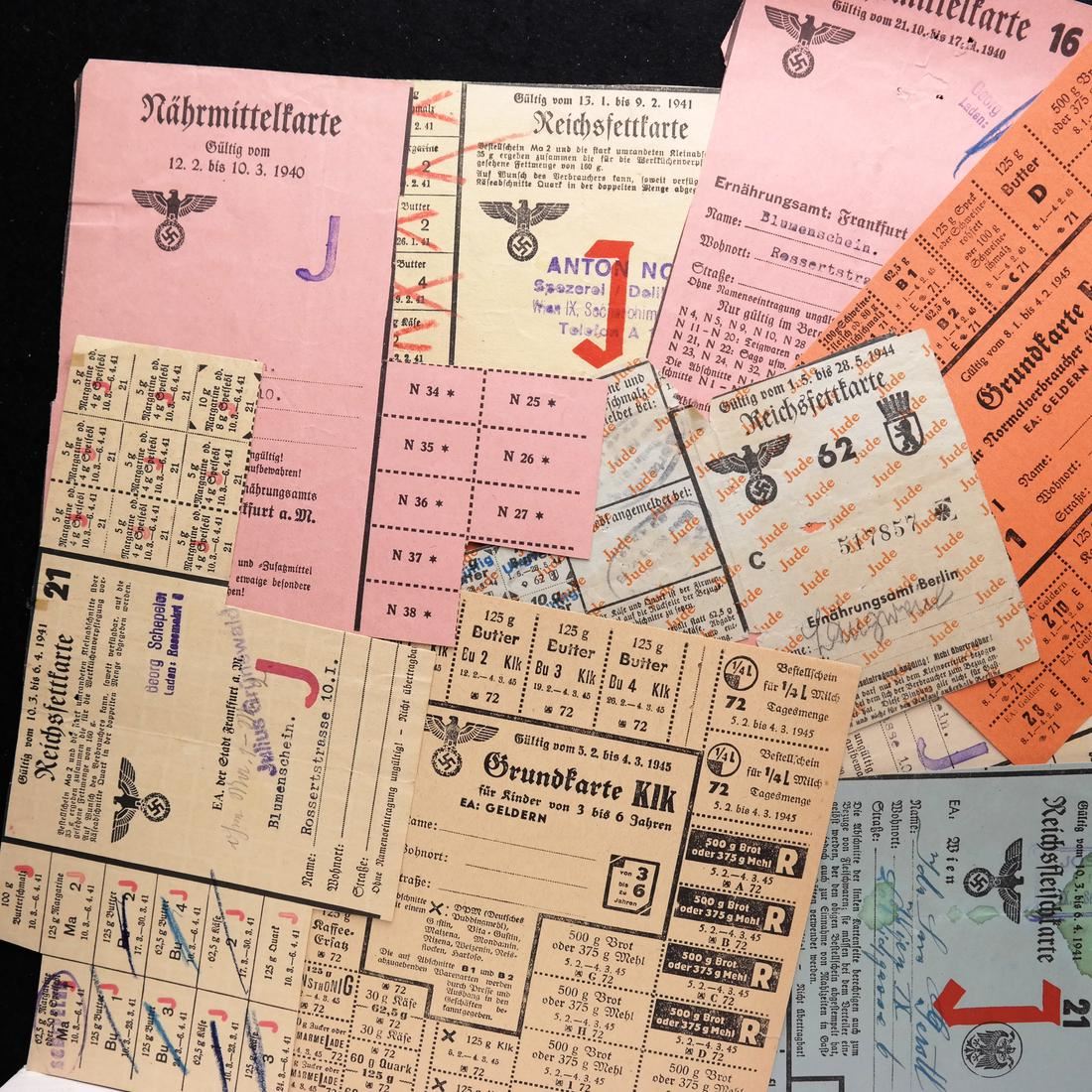Includes German ration card for 3-6 year old child, German normal ration card for over age 18, Krakow (Poland) ration card, then a group of ration items stamped J or Jude for Jewish from Frankfurt, Vienna and Berlin, including Jewish ration card for child under age 3, generally sound and F-XF.
