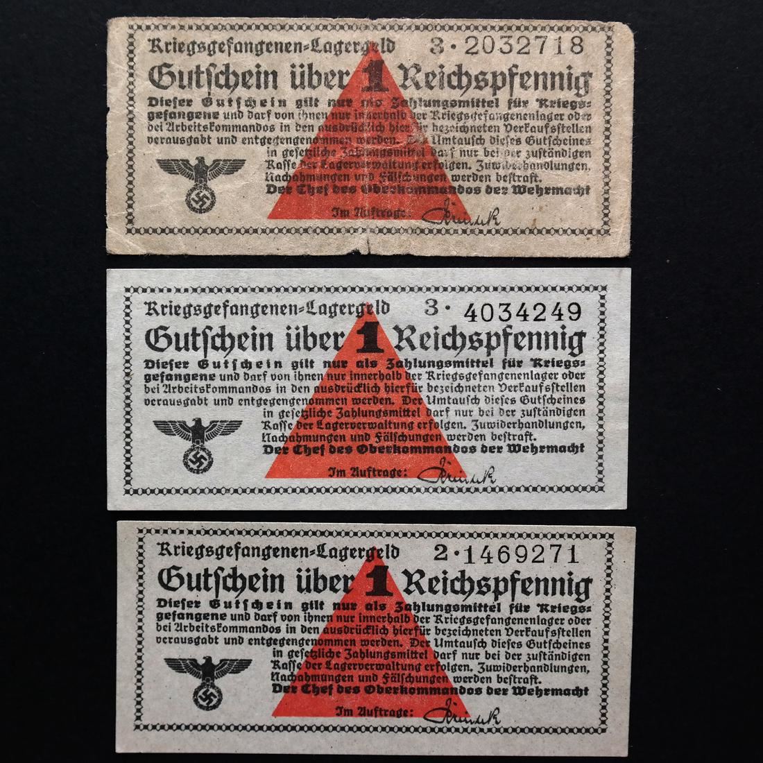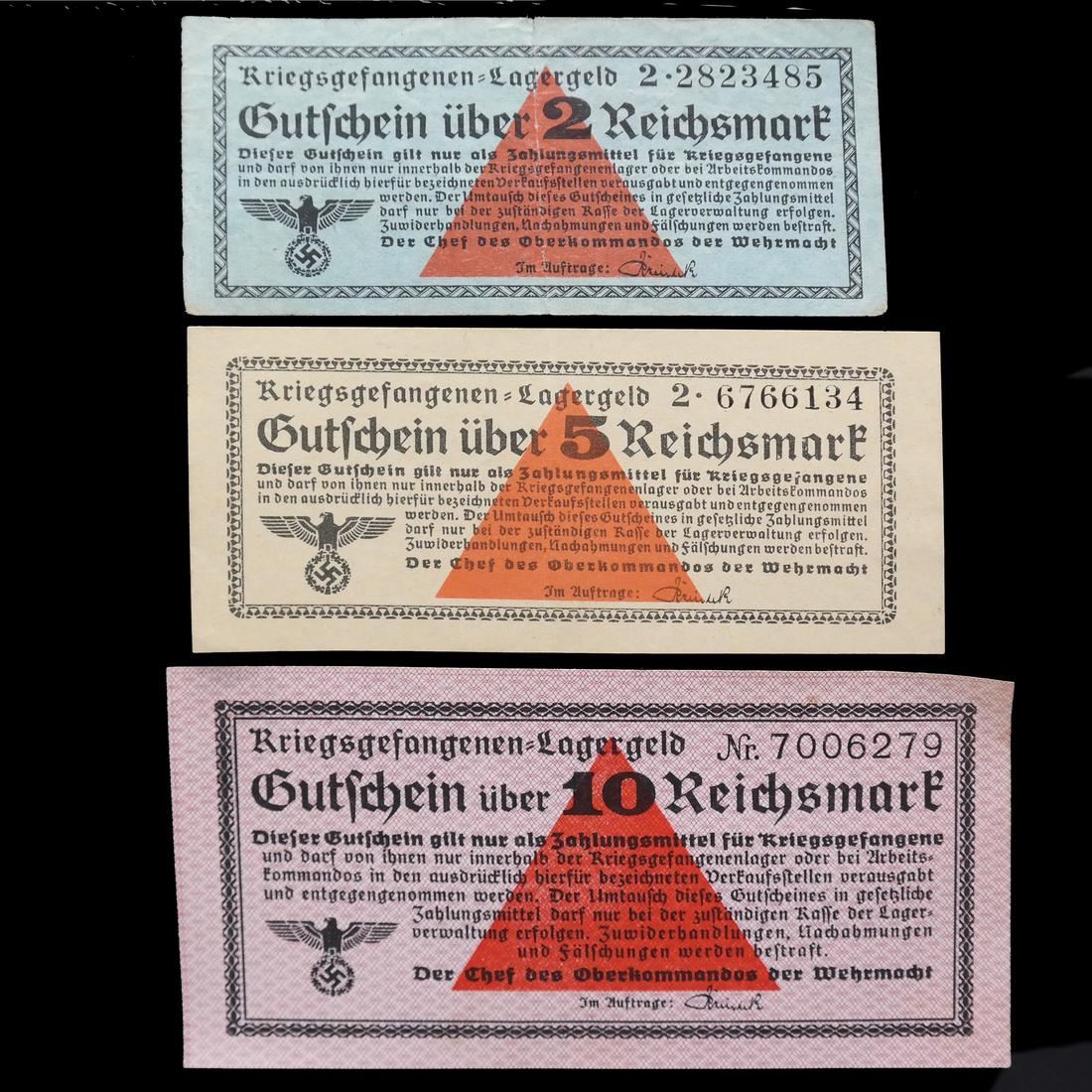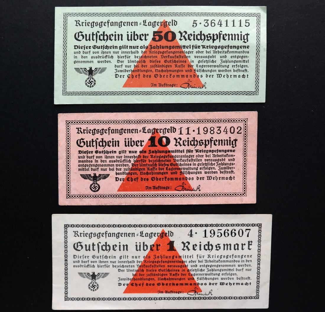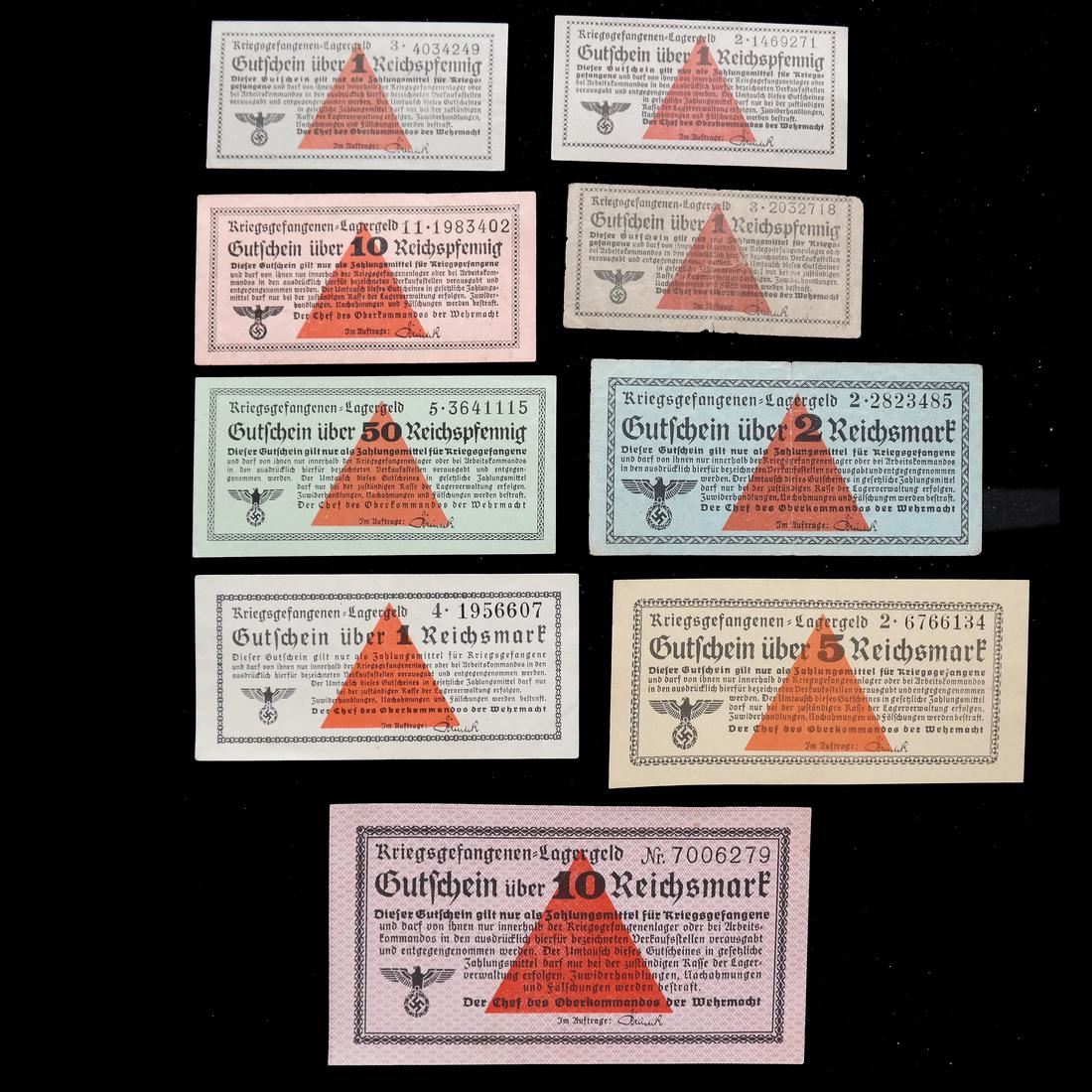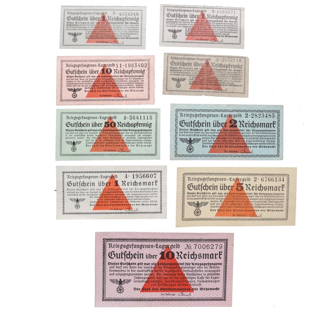 Kriegsgefangenen Lagergeld 1rpf (2), 10rpf, 50rpf, 1RM, 2RM, 5RM and 10RM notes, also a 1rpf with Stalag VI E handstamp on reverse for Soest camp, some folds and creases, generally sound and VF to Uncirculated.