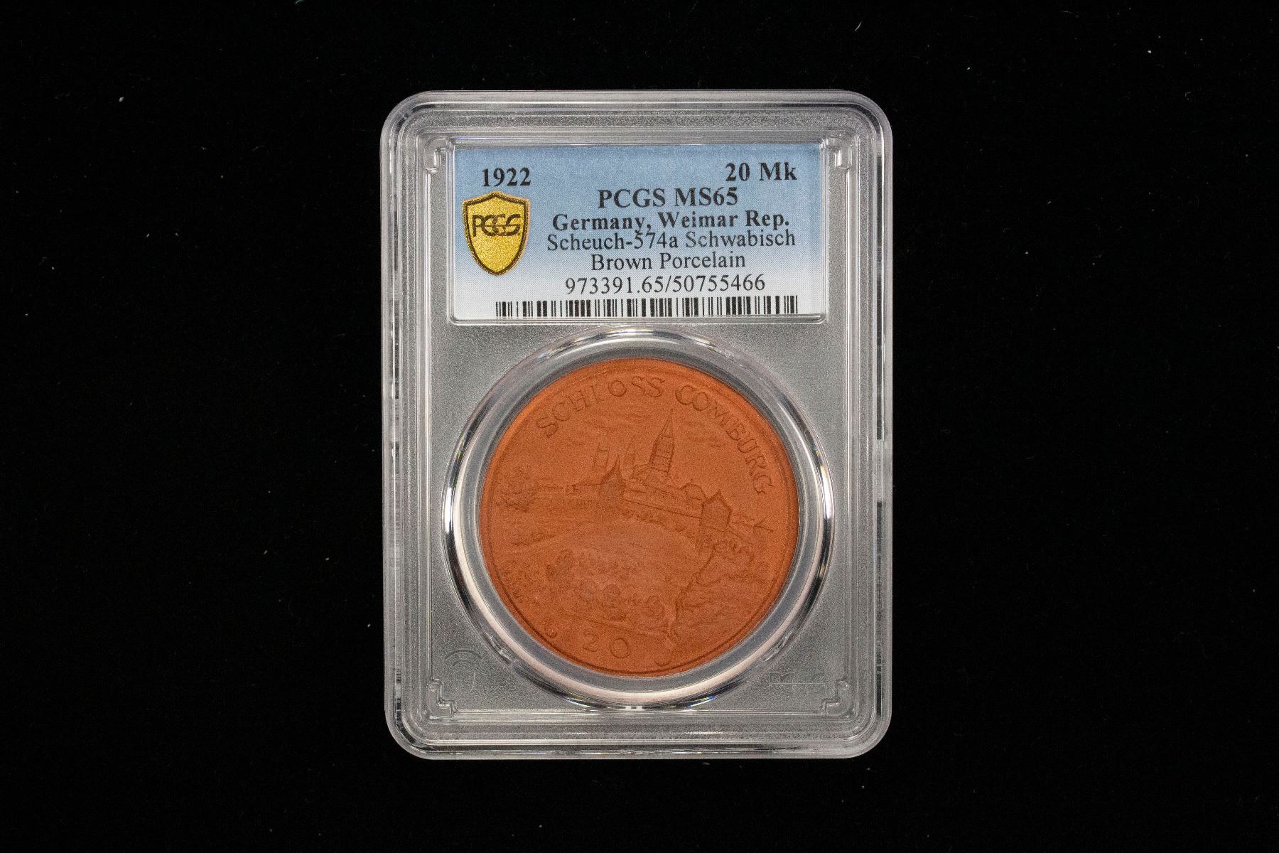 GERMANY: Weimar Republic, 20 mark, Schwabisch Hall, 1922, Scheuch-574a, brown porcelain, medallic, sometimes referred to as "spendenmedaillen", a superb intricately etched earthy reddish-brown mint state example! PCGS graded MS65.