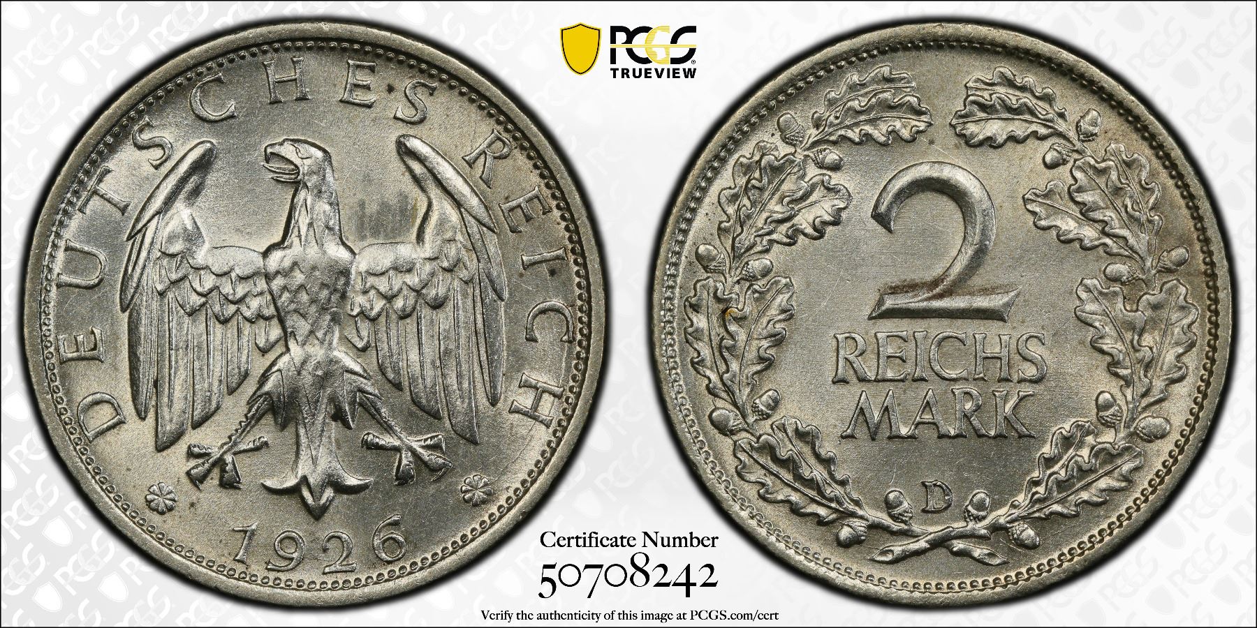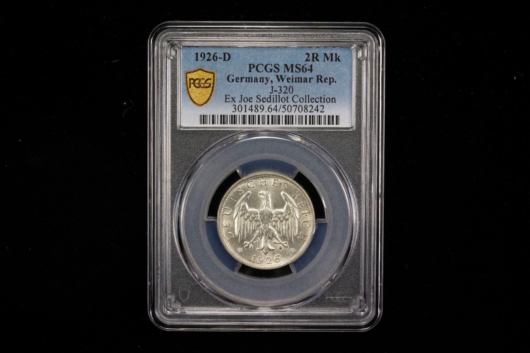 GERMANY: Weimar Republic, AR 2 reichsmark, 1926-D, KM-45, J-320, a wonderful mint state example! PCGS graded MS64, ex Joe Sedillot Collection.