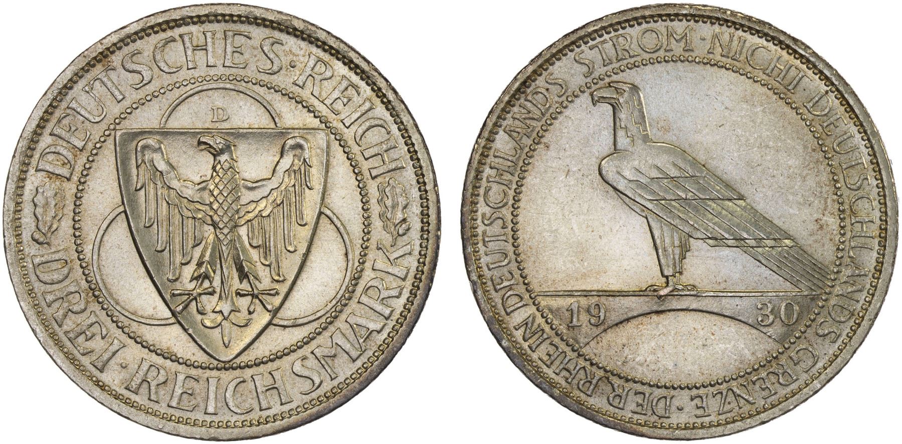 GERMANY: Weimar Republic, AR 3 reichmark, 1930-D, KM-70, J-345, Commemorating the Liberation of the Rhineland, lustrous fields, faint surface hairlines, Unc. Following the signing of the Locarno Treaties that settled Germany's western border in late 1925, the northern occupation zone around Cologne was evacuated in January 1926. The Koblenz region, which the Americans had handed over to the French in 1923, was evacuated in November 1929. After a "final" agreement on reparations was reached in the 1929 Young Plan, the occupation of the Rhineland ended on 30 June 1930, five years earlier than originally set down in the Treaty of Versailles.
