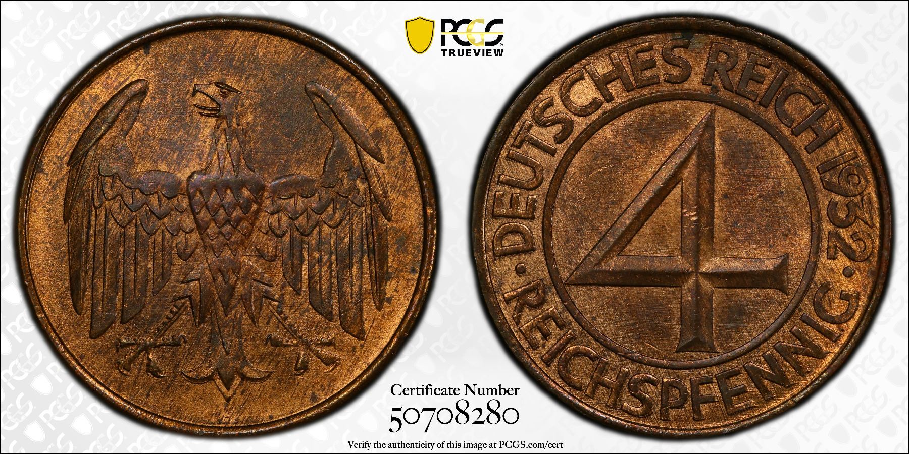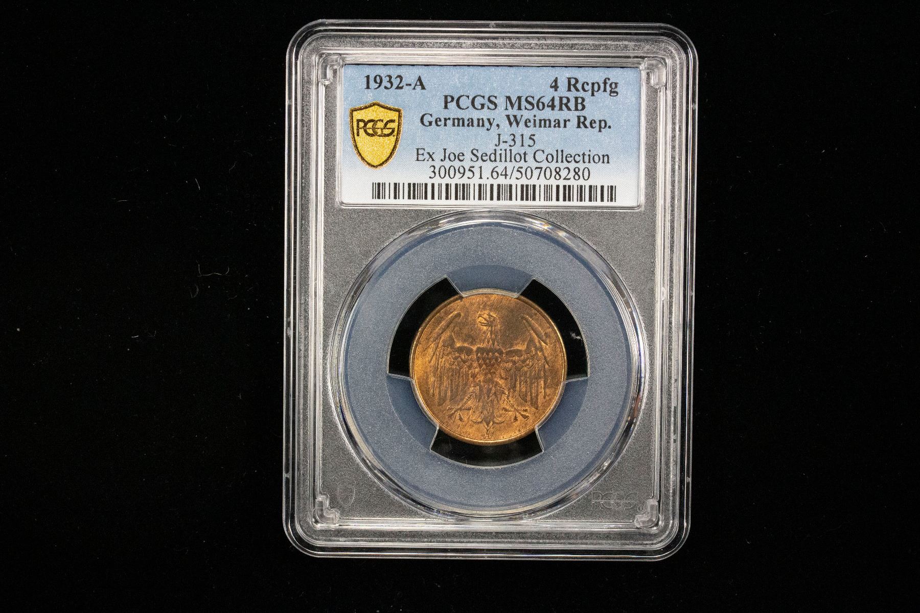 GERMANY: Weimar Republic, AR 3 reichsmark, 1932-F, KM-75, Y-39, J-315, a wonderful lustrous example! PCGS graded MS64 RB, ex Joe Sedillot Collection.