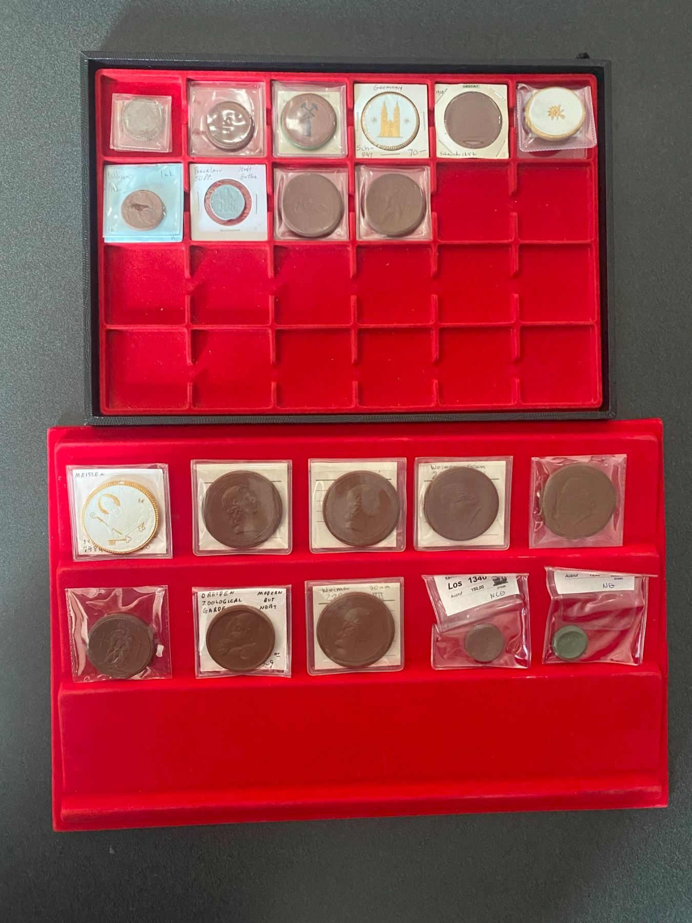GERMANY: Weimar Republic, LOT of 20 porcelain notgeld, all Weimar except one modern piece, including Berlin ND 10 mark War Disabled (3 pcs), Boldixum 1920 1 mark, Dessau 1928 German-America Flight, Deutsches Reich 1920 1 mark, Dresden ND Zoological Garden/Chimpanzees (modern), Eisenach 1921 1 mark Luther, Freiberg 1921 1 mark, Johann Wolfgang von Goethe (2), Gotha 1920 50 pfennig, Meissen 1921 Diocese Restoration, Meissen 1921 Ludwig Richter Fest, Plauen 1922 St. John's Church, Saxony ND (1933) German Saar, Friedrich von Schiller (3), and Waldenburg 1921 50 pfennig; all unc, in consignor's holders, viewing recommended; retail value $475, lot of 20 pieces.