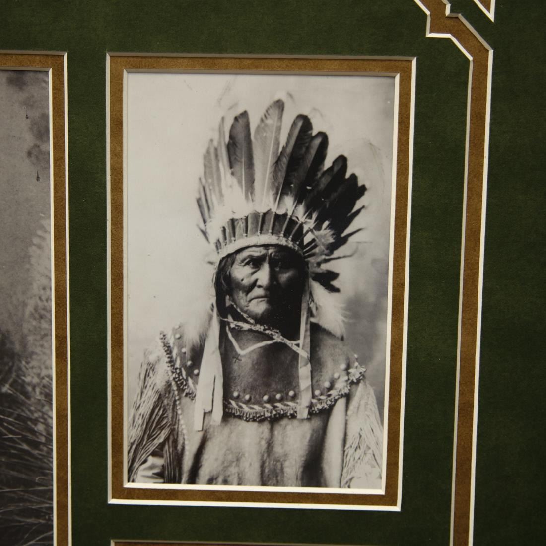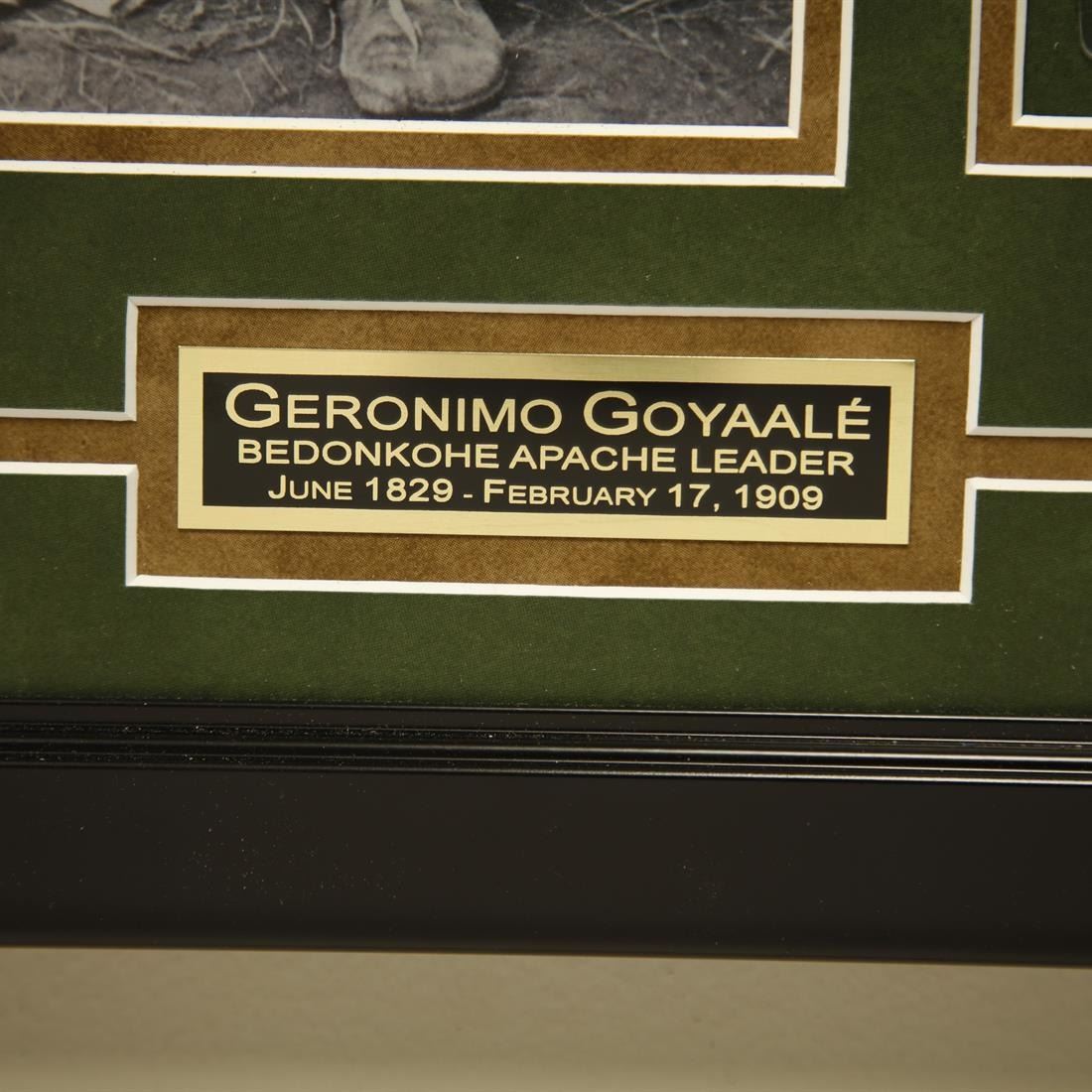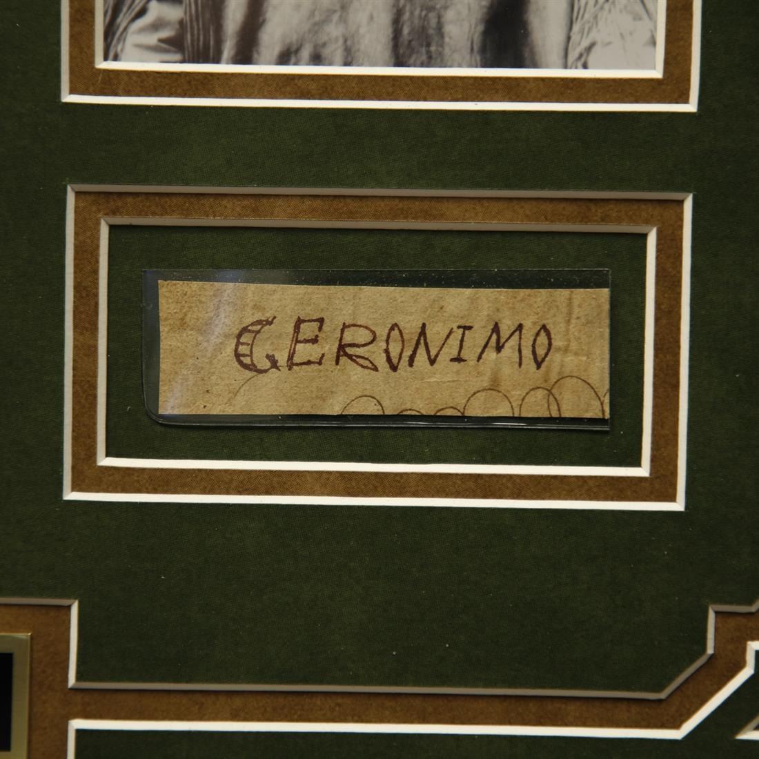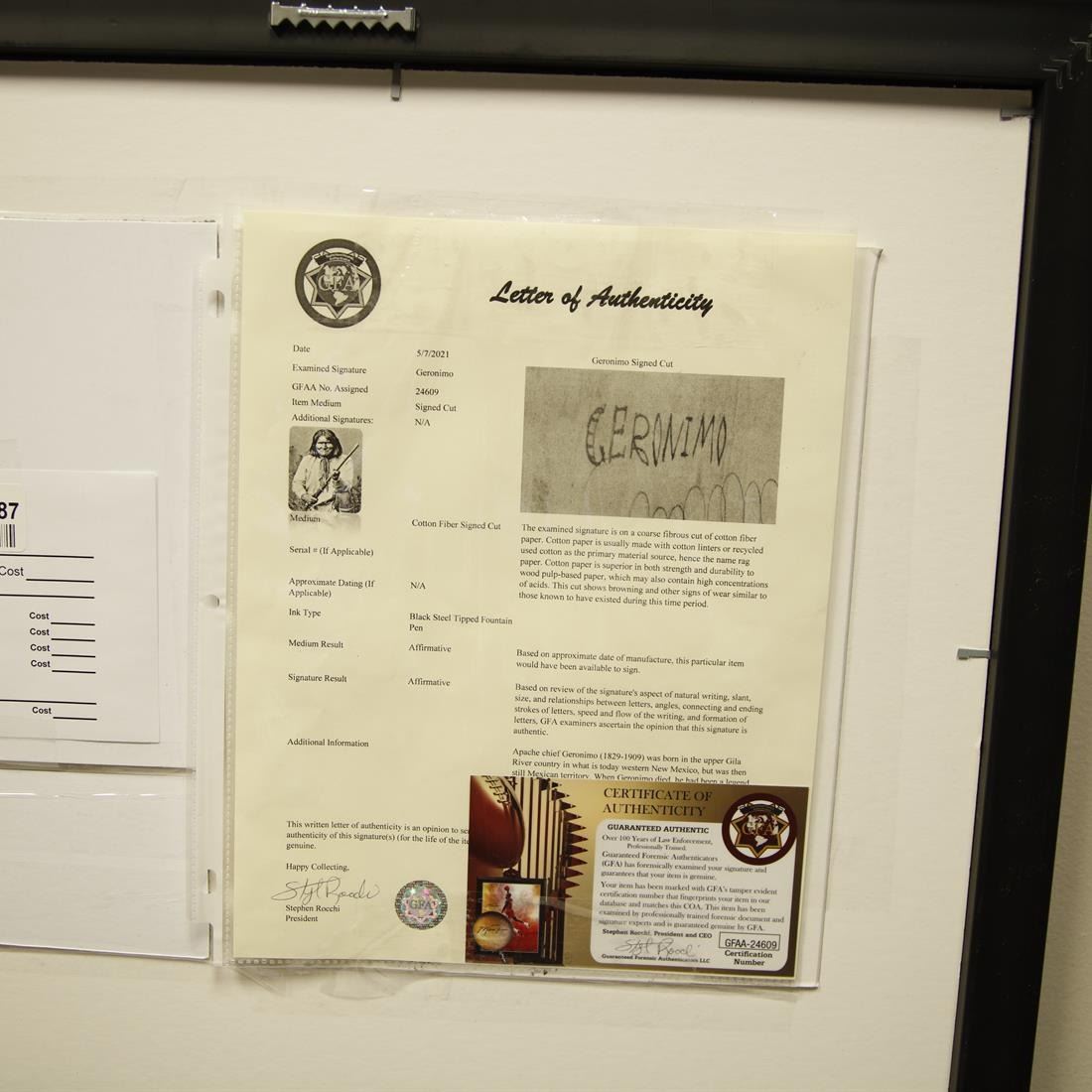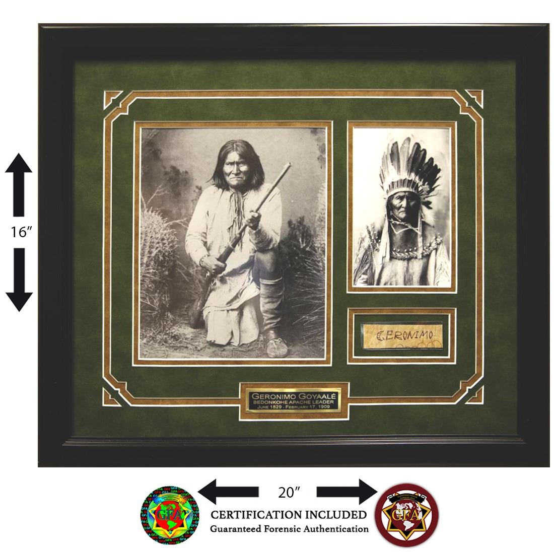 Geronimo (June 16, 1829–February 17, 1909) Geronimo signed cut paper in black ink, the black ink has oxidized over time. His block style letter signature is unique in its style and character forms. Geronimo was a major attraction at Fairs and Exhibitions in the late 1800’s and early 1900’s. Although he refused to adopt to the lifestyle of the white man, he seemed enjoy "performing" for mesmerized audiences. Accompanied by a retinue of Apache men, women and children, he formed official exhibitions at several major expositions. There he entertained crowds with singing and dancing, demonstrated the craft of making bows and arrows, and of would sell his autographs. Comes with a Letter of Authentication from Guaranteed Forensic Authenticators (GFA), along with the GFA guarantee of authenticity.