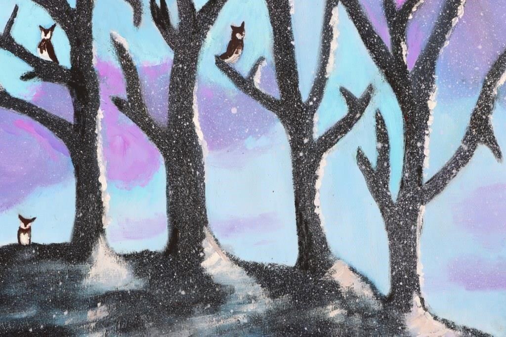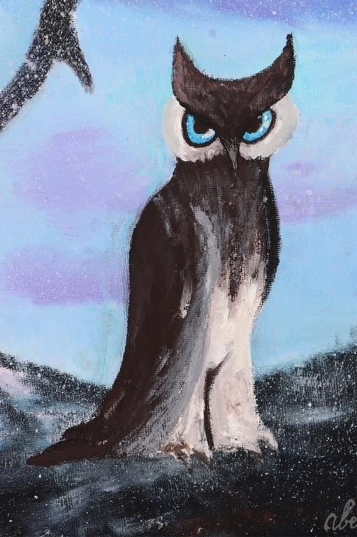 Gertrude Abercrombie (American, 1909-1977) original oil painting depicting an owl and tree. This is an original painting made by an unknown artist in the same manner and style as Abercrombie. Called "the queen of the bohemian artists", Abercrombie was involved in the Chicago jazz scene and was friends with musicians such as Dizzy Gillespie, Charlie Parker, and Sarah Vaughan, whose music inspired her own creative work.