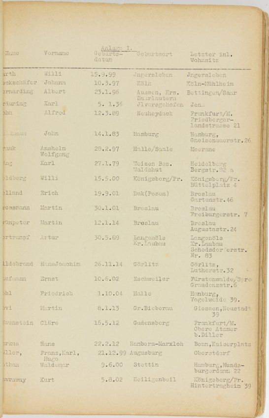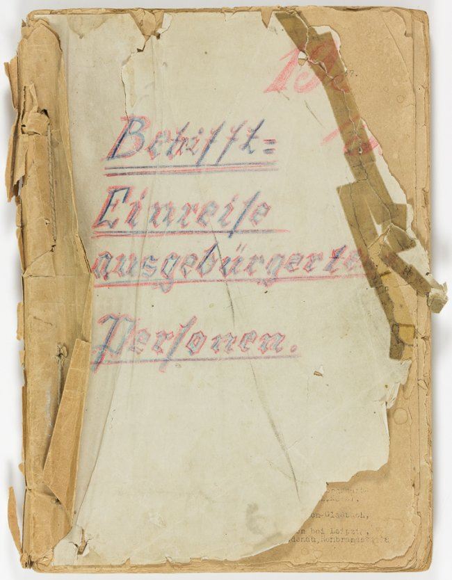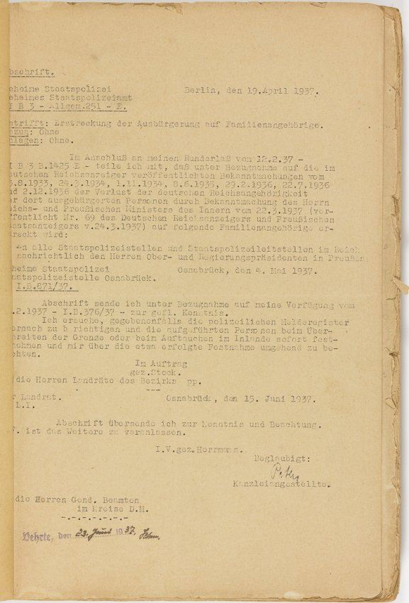 A bound list of dozens of war-date copies of typed transcripts of correspondence between Gestapo and SS Headquarters in Berlin, and Gestapo Headquarters in Osnabruck, approx. 200pp. large 4to., covering the period of Feb. 12, 1937 to Sep. 15, 1938. The documents, string-bound, are essentially identical in form: in letters signed in type, some by Heinrich Muller, Berlin provides the names of those who have emigrated and have therefore been stripped of their citizenship with instructions that the individuals be arrested should they attempt to re-enter the country. The emigrant's name, date of birth, place of birth, and last place of residence in Germany are all set forth in alphabetical order. These copies were then sent to the local gendarmeries for reference once a suspected illegal immigrant was arrested. This is a frightening reference: we see entire families fleeing from every part of Germany, and as Osnabruck was not far from the Dutch border, the Germans wanted to ensure that the local police were enlisted in preventing Jews from illegally returning to obtain any of their confiscated monies or property. Overall very good condition, and worth of research.
