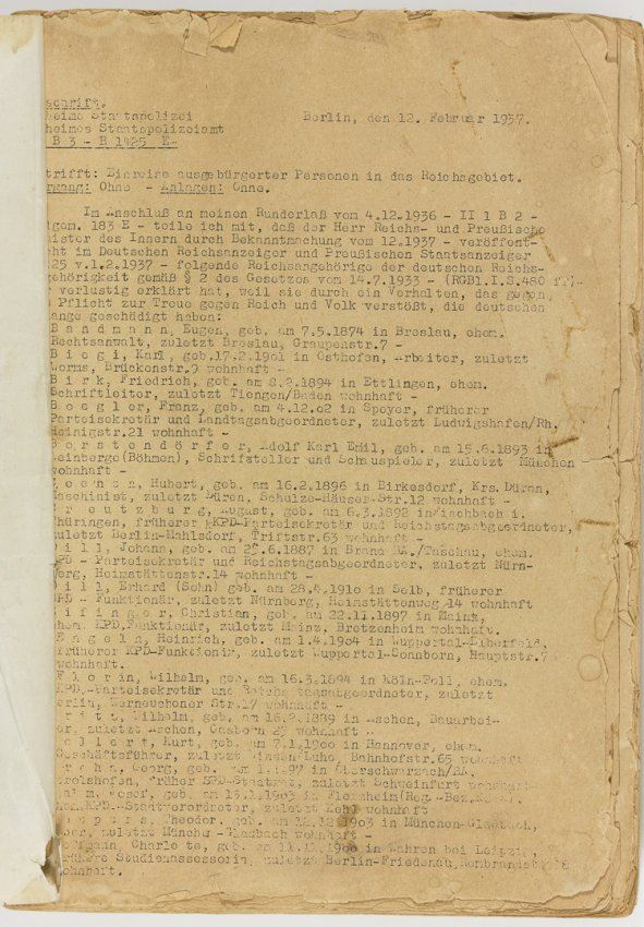 GESTAPO LISTS OF JEWS WHO HAVE FLED GERMANY AND TO BE RE-ARRESTED ON THEIR RETURN