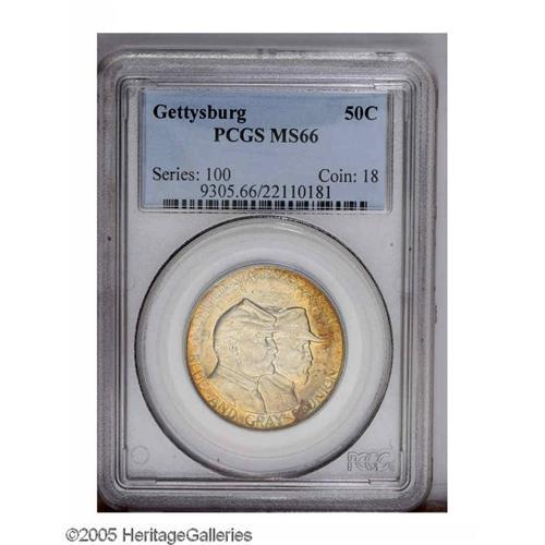 <B>1936<50C> Gettysburg MS66 PCGS.</B></I> Fully lustrous with silvery-gray central coloration and touches of golden peripheral toning, which is more prevalent on the obverse. The strike is bold for the issue, and the surfaces are devoid of significant abrasions.<BR><I>From The Henry R. Luhrs Collection.</B></I>