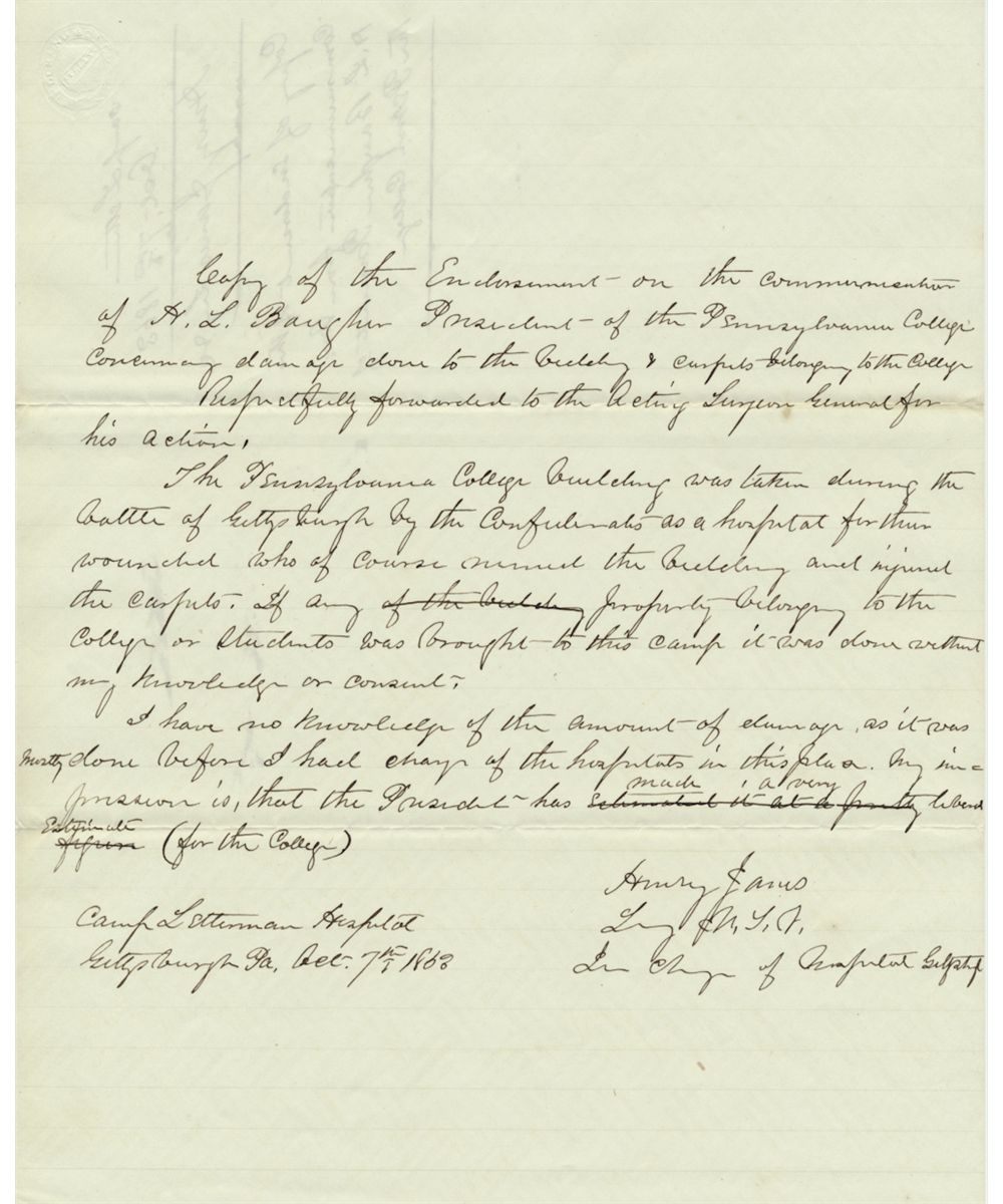 A rare Gettysburg related D.S. by Surgeon Henry Janes, as director of Camp Letterman, ., 1p. 4to., "Camp Letterman, Gettysburgh Pa., Oct. 7th, 1863", being the draft of a cover letter concerning damages sustained at Pennsylvania College (today's Gettysburg College), in part: "Copy of the endorsement on the commensuration of H. L. Baugher, President of the Pennsylvania College concerning damages done to the building & carpets belonging to the college…the Pennsylvania College building was taken during the battle of Gettysbugh by the Confederates as a hospital for their wounded who of course ruined the building and injured the carpets. If any property belonging to the college or students was brought to this camp it was done without my knowledge or consent. I have no knowledge of the amount of damage, as it was mostly done before I had charge of the hospitals in this place. My impression is that the President has made a very liberal estimate (for the college)…". Fine.