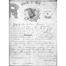 <b>647. GETTYSBURG REGIMENTAL FLAG REMNANTS </b>A great Gettysburg relic, two small segments of the regimental battle flag of the 31st Pennsylvania Infantry, originally the 2nd Pa. Reserves. The relics include one rather tattered 2" x 2" section of white cloth, with a 2" x 1 1/2" gold-painted cloth letter "R". Both flag relics are encased in a period frame with the "eagle" discharge of Pvt. William Morrison, Co. E, released from service on June 16, 1864. The regiment's flag was presumably cut up and passed out as souvenirs, as a new flag (copy included) was issued on Mar. 16, 1864. The 31st had a distinguished battle record, fighting at Second Bull Run, Chantilly, Antietam, Fredericksburg, and Gettysburg where they made a brilliant charge and took the colors of the 15th Georgia. Morrison's discharge is toned, the relics are very good.<b>$400-600</b>