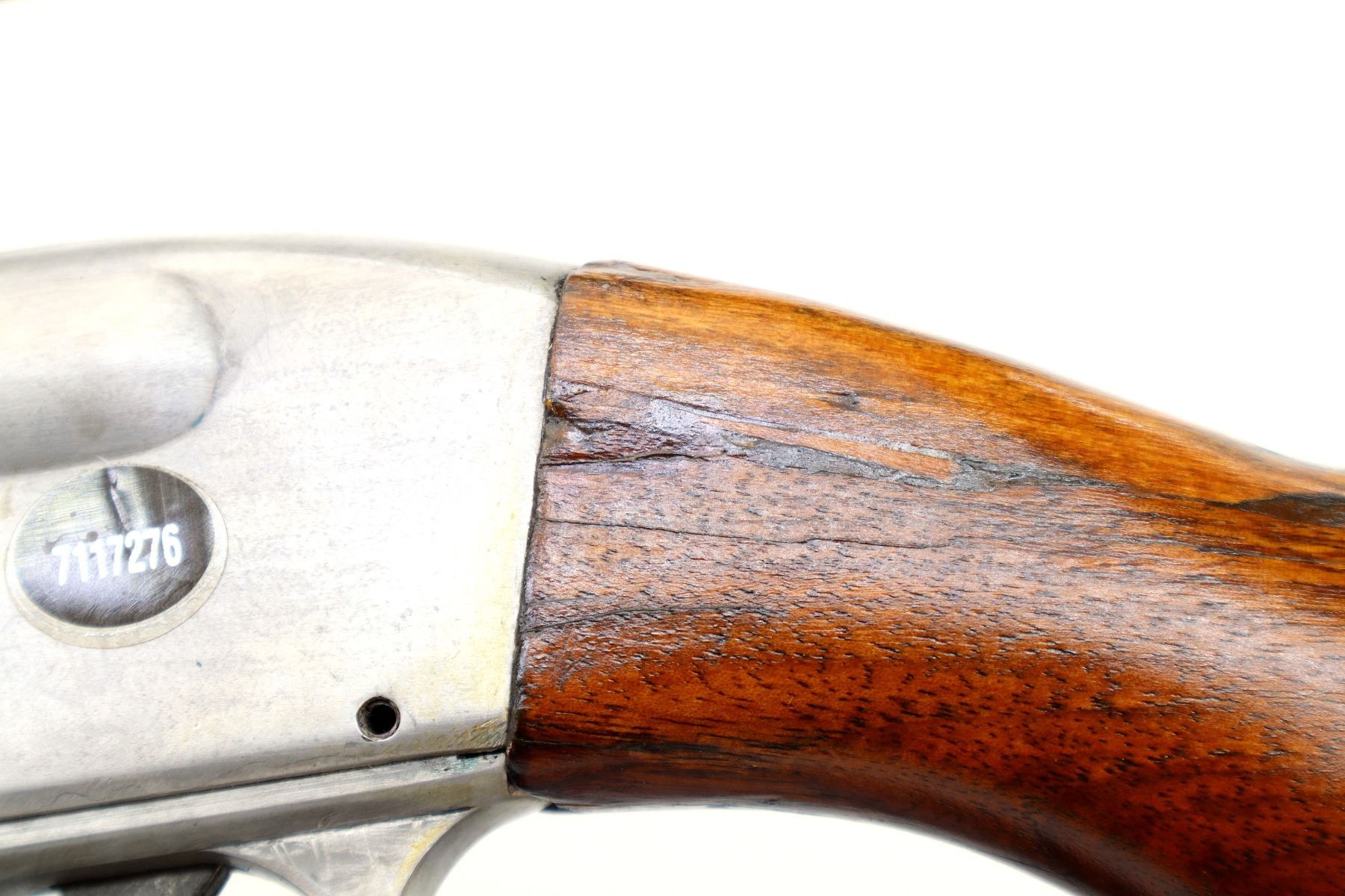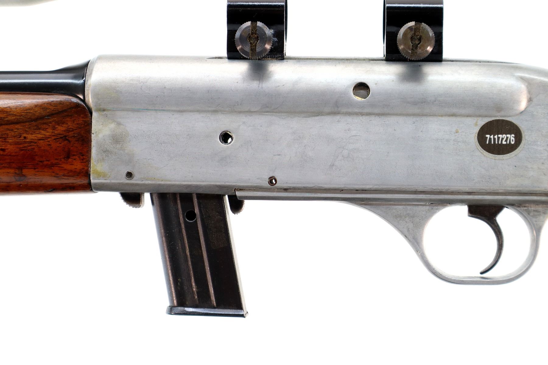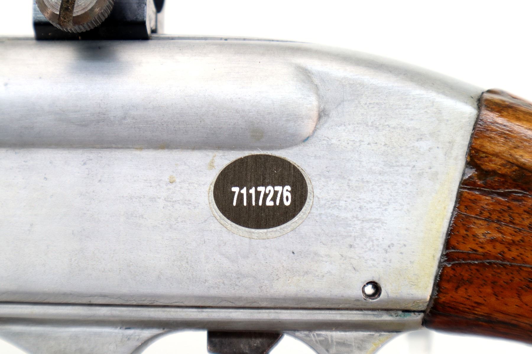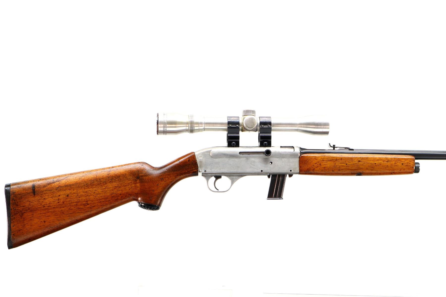 Main Description: Blade front sight, adjustable u notched rear sight, reblued round barrel, polish silver grooved alloy receiver with unknown 4x32 scope installed, clear optics with duplex crosshair. Two piece wood stocks, pistol grip chipped and cracked behind receiver, grooved black polymer butt plate, grip cap.