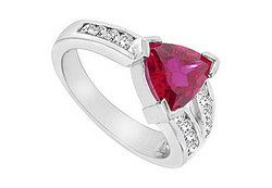 A trillion-cut GF bangkok ruby is delicately set in the middle. Smaller CZs followed by channel-setting on one side with single row and double rows on the other side. This stylish ring is made in 10K white gold & has a total gem weight (TGW) of 1.75 carat.