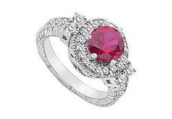 A round GF bangkok ruby is prong-set in the center & is surrounded by round CZs. Edges are detailed with fine milgrain work in between smaller CZs on the sides. Made in 10K white gold this ring had a total gem weight (TGW) of 2.75 carat.