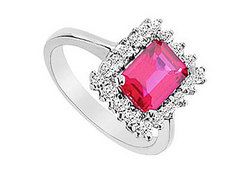 A rectangle shape GF bangkok ruby is surrounded by twenty-two smaller round white CZs. Made in 10K white gold this gemstone ring has a total weight (TGW) of 3.66 carat.
