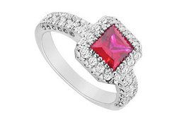 A square GF bangkok ruby is surrounded by round CZs all around and on sides too. Made in 10K white gold this ring has a total weight (TGW) of 2.50 carat.