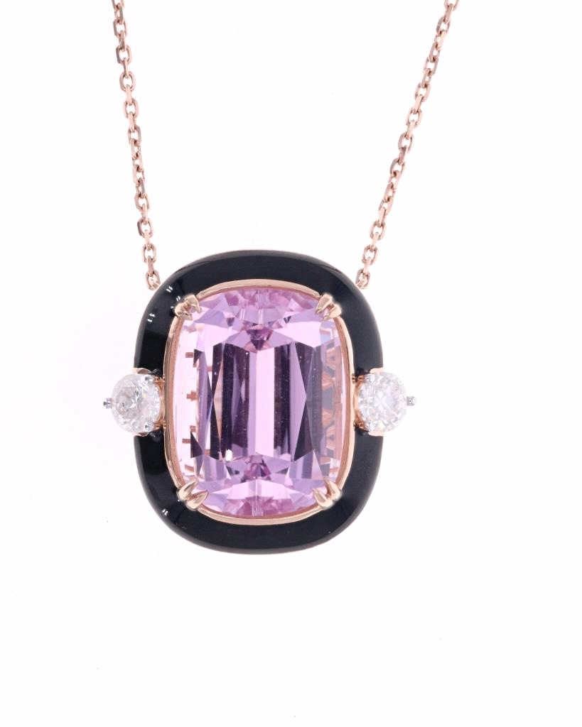 For your consideration is this beautiful & natural 37.08 CTW Kunzite Spodumene, 1.36 CTW diamond & 14k gold necklace with GGA paperwork. The necklace shows a polished rose & white gold construction and is marked on the back reading, "Oscar Friedman 14k". The necklace pendant shows a center stone of natural, cushion brilliant cut 37.08 CTW Kunzite Spodumene with dimensions of 21.44 x 16.10 mm, type I clarity, 5/5 pink coloring with an intense rating and an excellent rating in symmetry. On either side of the Kunzite Spodumene are two, round brilliant cut diamonds with a CTW of 1.36, dimensions of 5.5 x 5.4 mm, an average clarity of SI1 - SI2, an average color of G - H and excellent ratings in symmetry and polish. Encircling the center gemstone is black enamel. The piece comes complete with GGA(GemAssure Gemological Appraisals, GGA Appraisal Number#: GGA074763 and trace number: NK017015) report and appraisal confirming the above info and giving a total value of $27,590.00. It has a total weight of 16.7 grams. NK017015