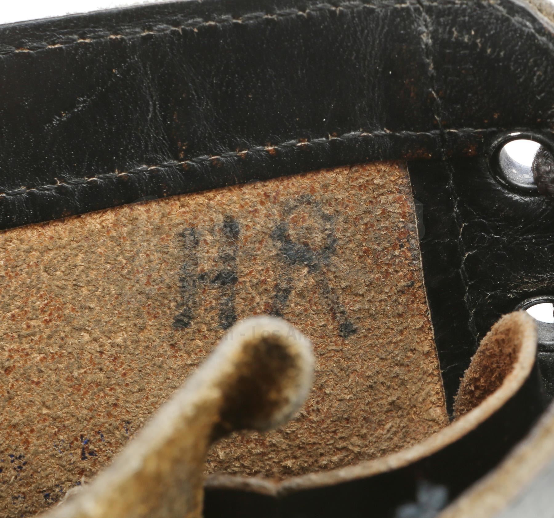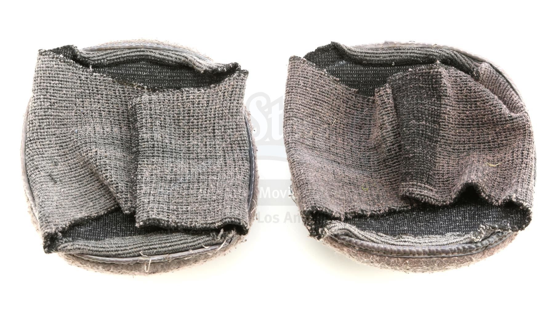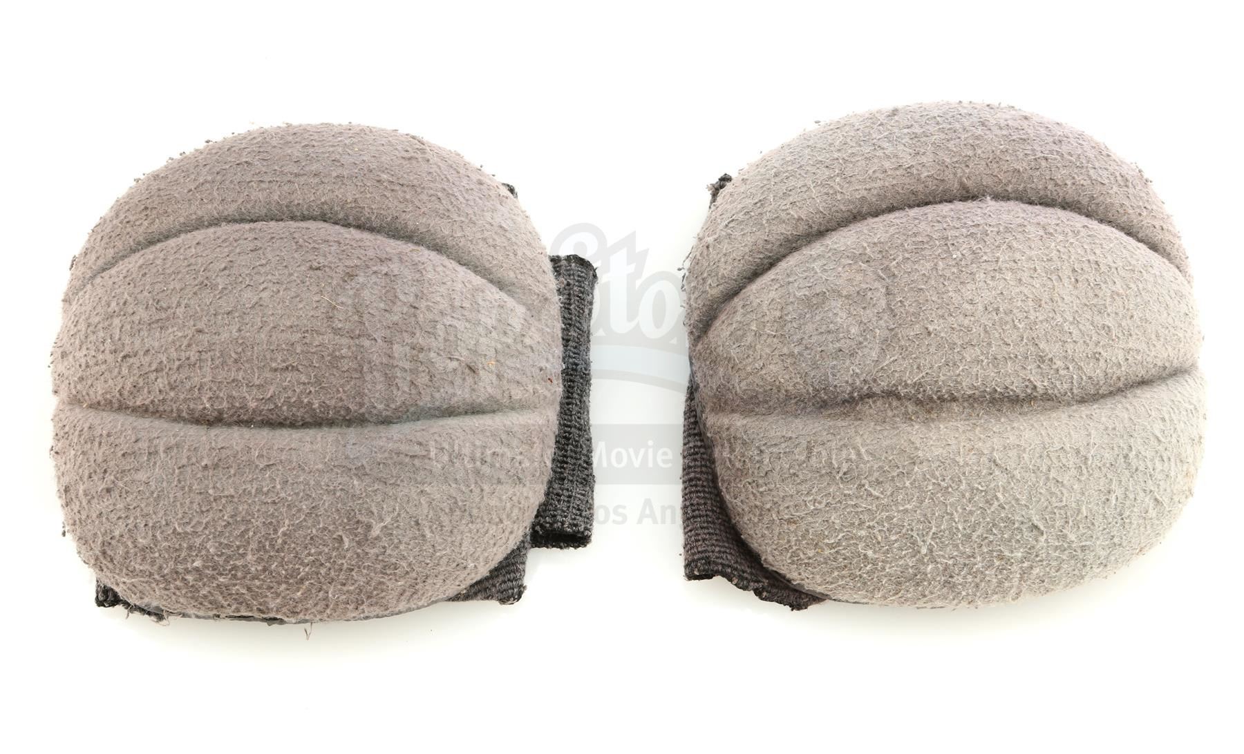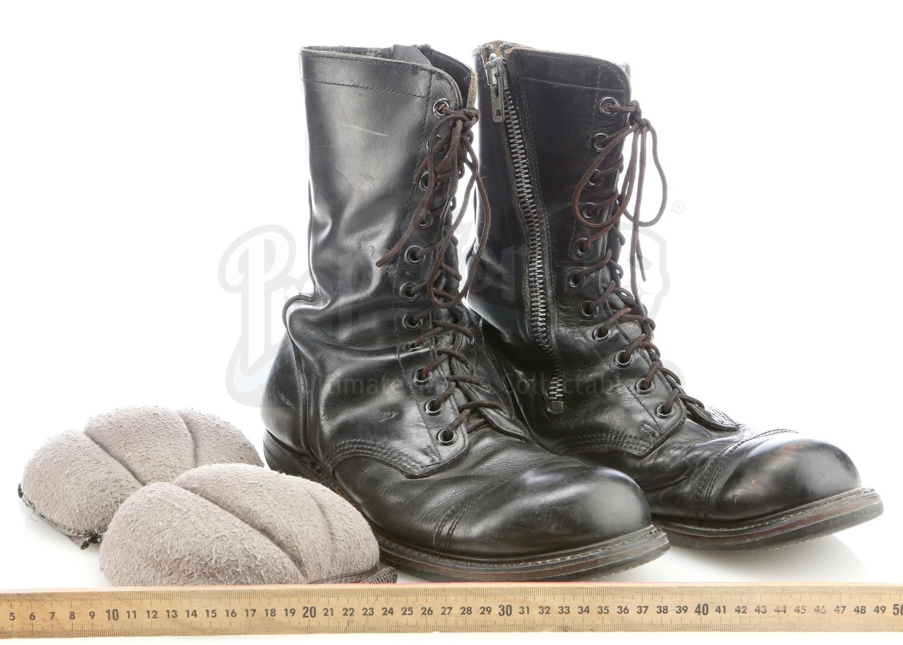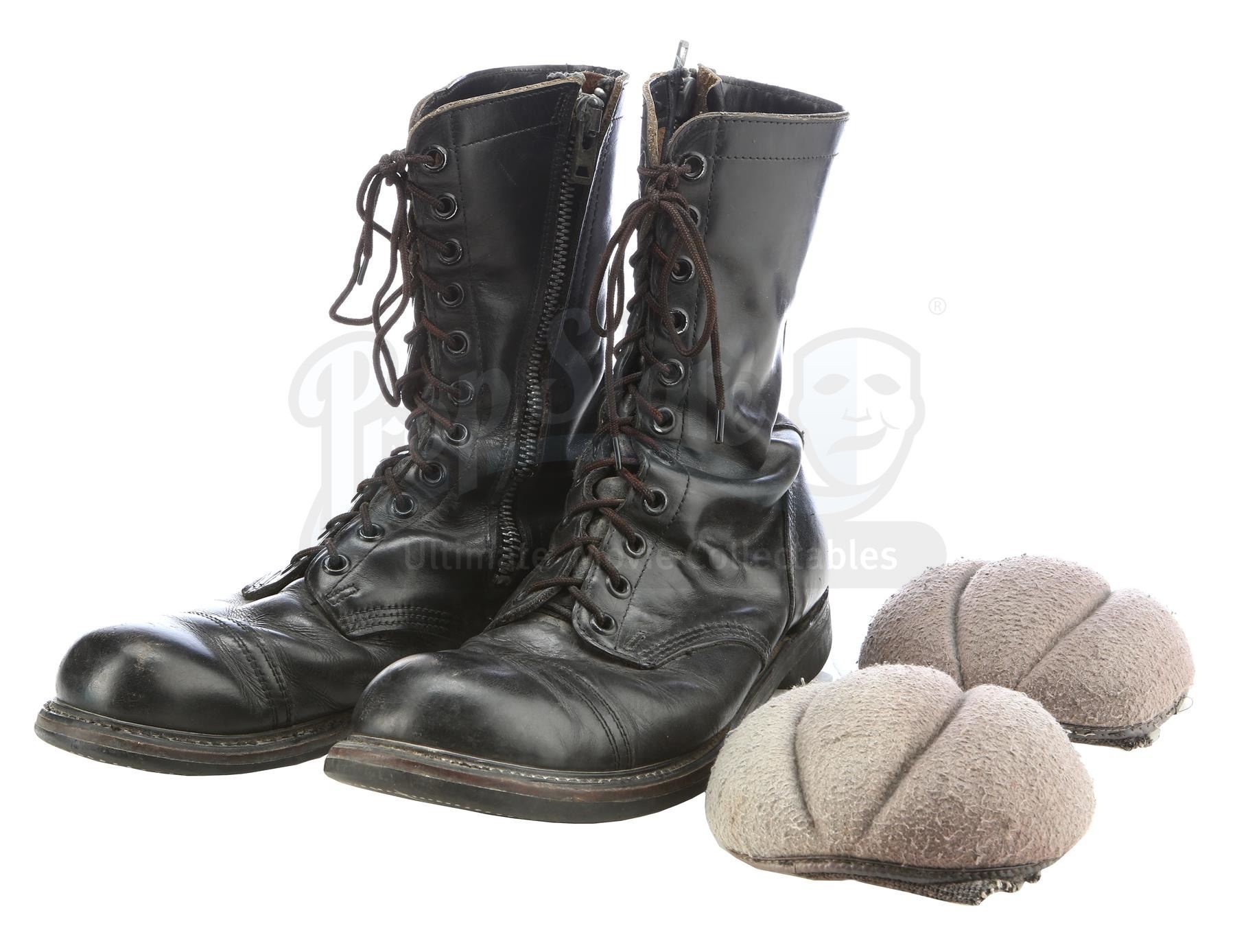 This pair of black leather and rubber boots have laces and zippers on the sides and are labelled "HR" on the interiors, and a pair of grey and charcoal-coloured cotton elbow pads from the uniform. There is some scuffing and wear to the interior and exterior of the boots as well as some color fading on the elbow pads. This lot comes from the collection of Peter Mosen, widely known as the first-ever "Ghost-head" (Ghostbusters super-fan), who was part of numerous official Ghostbusters publicity event; Mosen obtained the items directly from the studio shortly after filming. Dimensions: 32.5 cm x 28 cm x 25.5 cm (123/4 " x 11" x 10")