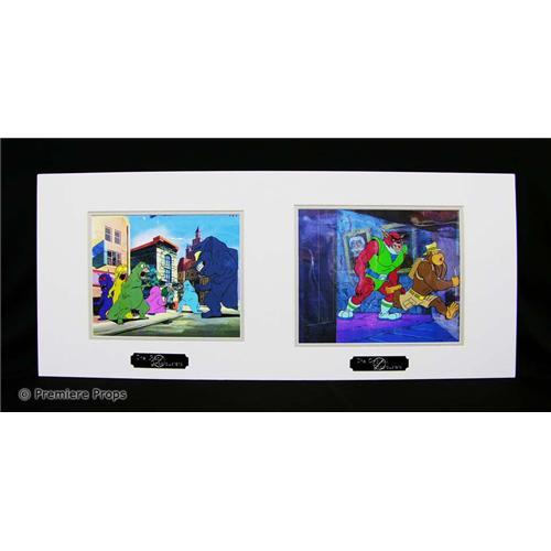 "The Real Ghostbusters" and "The Original Ghostbusters" animation cels - Includes 2 different cels mounted side by side (measures ~ 33" x 14") (FLM3000) This item is oversized and will require additional shipping charges. Please e-mail for shipping rates before bidding.