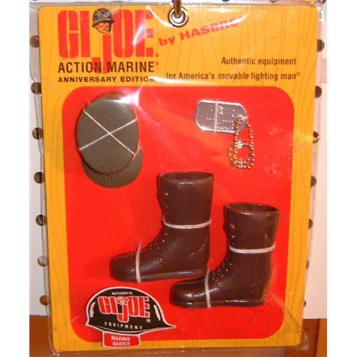 This 2003 Anniversary Edition of the 1964 carded GI Joe Action Basics set is, except for the "Anniversary Edition" markings on the card, is a replica of the 1964 set. It includes a GI Joe Marine Fatigue Hat, Tall Brown Boots, and Dog Tags. Check out the photos and feel free to ask any questions. Thanks!