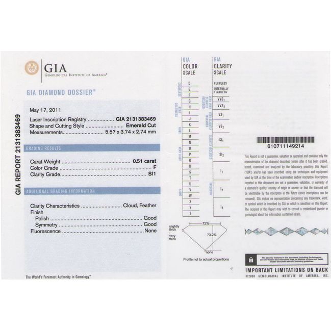 GIA 0.51 ctw Certified Emerald Brilliant Diamond F,SI1 **|**|** Certification: GIA ; CTW: 0.51 ; Shape: Emerald Brilliant ; Color: F ; Ckarity:SI1 ; Pol: G ; Sym: G ; Floor: None ; Meas: 5.57x3.74x2.74 ; Depth: 73.2 ; Table: 72 ; Girdle: S Tck-V Tck ; Comment: 110 CLEAN ; MSRP: $2100