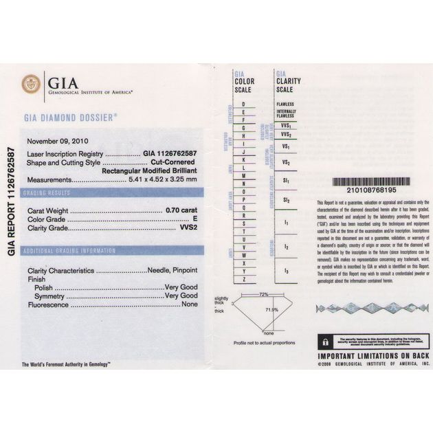 GIA 0.70 ctw Certified Radiant Brilliant Diamond E,VVS2 **|**|** Certification: GIA ; CTW: 0.7 ; Shape: Radiant Brilliant ; Clarity: E ; Ckarity:VVS2V G ; Sym: V G ; Floor: None ; Meas: 5.41x4.52x3.25 ; Depth: 71.9 ; Table: 72 ; Girdle: Tck ; MSRP: $7000