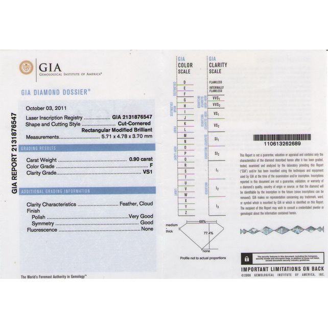 GIA 0.90 ctw Certified Radiant Diamond F,VS1 **|**|** ; MSRP: $5800