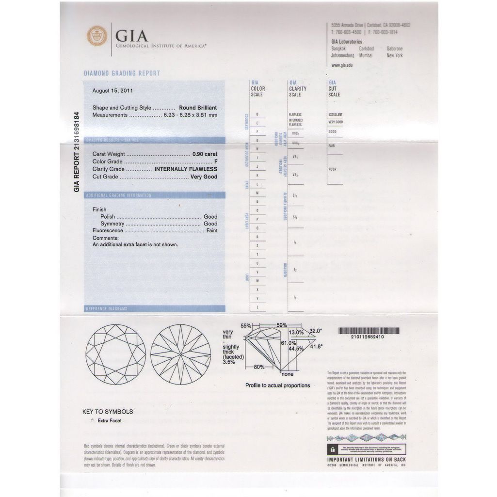 GIA 0.90 ctw Certified Round Brilliant Diamond F,IF **|**|** Certtification: GIA ; Shape: Round Brilliant ; Stone: Diamond ; Diamond Color: F ; Clarity: IF ; Cut: V G ; Pol: G ; Sym: G ; Flour: Faint Blue ; Meas: 6.23-6.28x3.81 ; Depth: 61 ; Table: 59 ; Girdle: V Thin ; MSRP: $25300