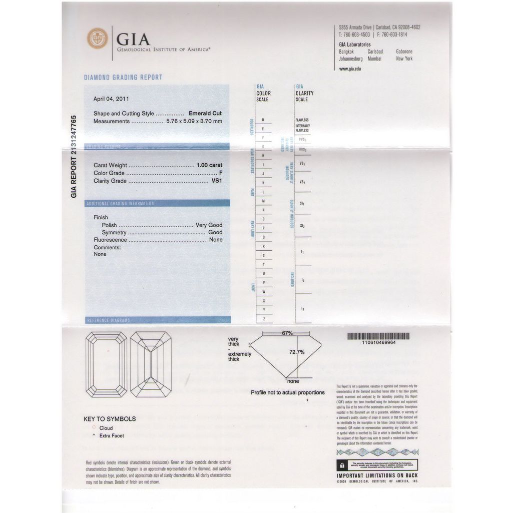 GIA 1.00ctw Certified Emerald Brilliant Diamond F,VS1 **|**|** Certification: GIA ; CTW: 1 ; Shape: Emerald Brilliant ; Color: F ; Ckarity:VS1 ; Pol: V G ; Sym: G ; Floor: None ; Meas: 5.76x5.09x3.70 ; Depth: 72.7 ; Table: 67 ; MSRP: $14200