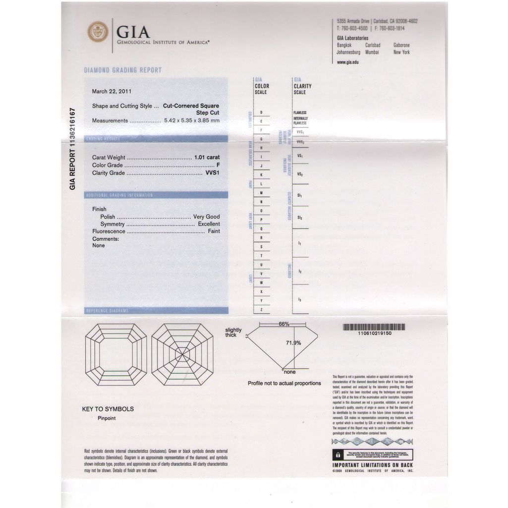 GIA 1.01 ctw Certified Asscher Brilliant Diamond F,VVS1 **|**|** Certification: GIA ; CTW: 1.01 ; Shape: Asscher Brilliant ; Color: F ; Ckarity:VVS1 ; Pol: V G ; Sym: X ; Floor: Faint Blue ; Meas: 5.42x5.35x3.85 ; Depth: 71.9 ; Table: 66 ; Girdle: S Tck ; MSRP: $16700