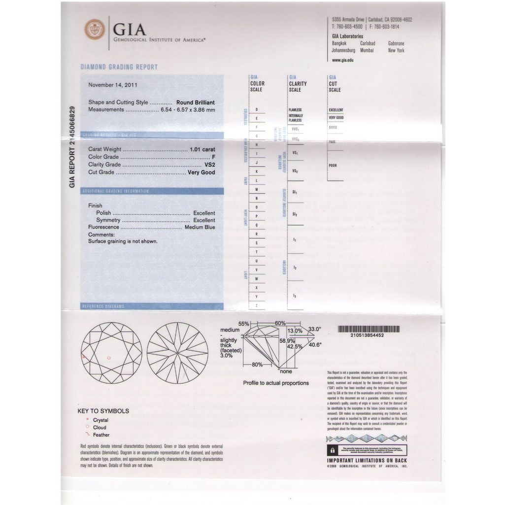 GIA 1.01 ctw Certified Round Brilliant Diamond F,VS2 **|**|** Certtification: GIA ; Shape: Round Brilliant ; Stone: Diamond ; Diamond Color: F ; Clarity: VS2 ; Cut: V G ; Pol: X ; Sym: X ; Flour: Med Blue ; Meas: 6.54-6.57x3.86 ; Depth: 58.9 ; Table: 60 ; Girdle: Med ; MSRP: $27800