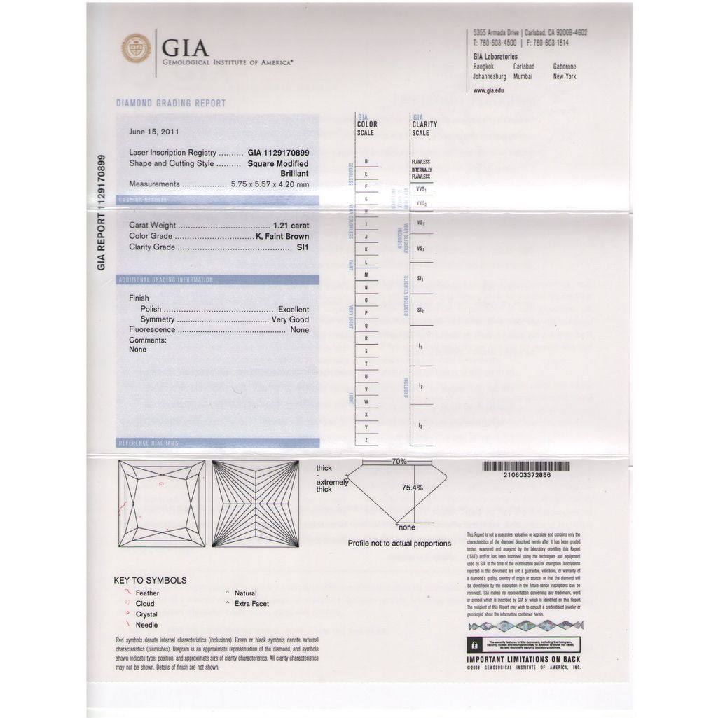 GIA 1.21 ctw Certified Princess Brilliant Diamond K,SI1 **|**|** Certification: GIA; Total CTW: 1.21 ; Shape: Princess ; Color: K; Clarity: SI1 ; Pol: X; Sym: V G; Flour: None ; Meas.: 5.75x5.57x4.20 ; Depth: 75.4 ; Table: 70 ; Girdle: Tck ; MSRP: $9200