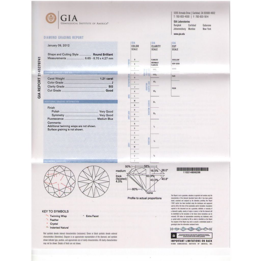 GIA 1.21 ctw Certified Round Brilliant Diamond J,SI2 **|**|** Certtification: GIA ; Shape: Round Brilliant ; Stone: Diamond ; Diamond Color: J ; Clarity: SI2 ; Cut: G ; Pol: V G ; Sym: V G ; Flour: Med Blue ; Meas: 6.65-6.70x4.27 ; Depth: 63.9 ; Table: 58 ; Girdle: Med ; Comment: WHITE AND EYECLEAN ; MSRP: $18100