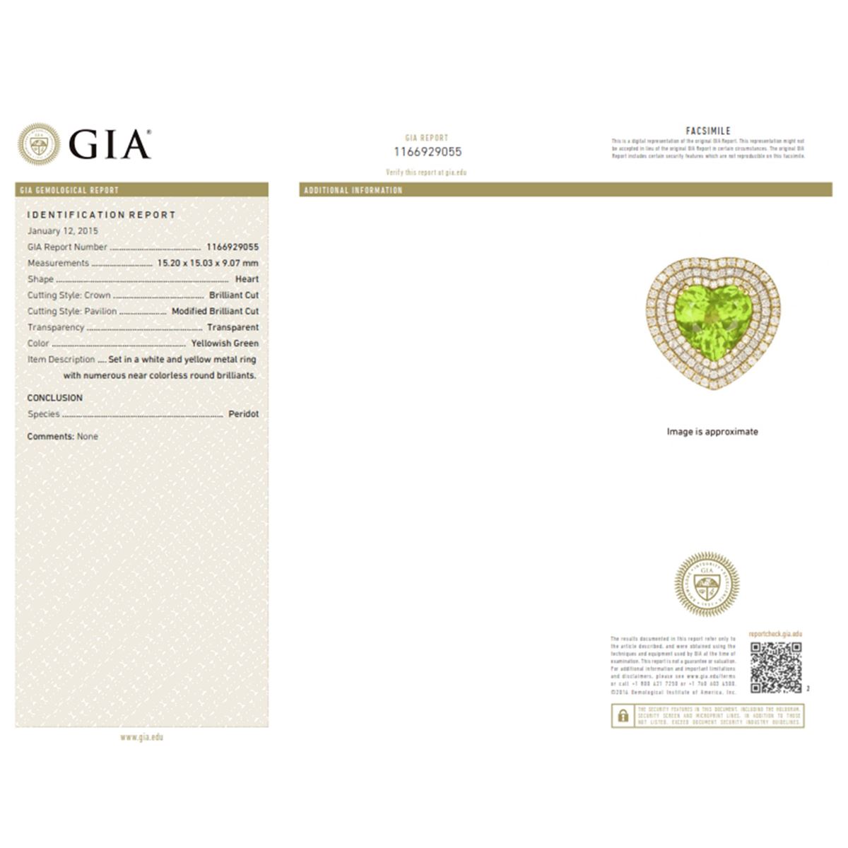 18K WHITE AND YELLOW GOLD NATURAL BURMA PERIDOT RING:15.25 GRAMS/DIAMOND:3.27CT/BURMA PERIDOT:12.54CT/GIA #1166929055/#GVR1184 ** GIA Certified Natural Burmese Peridot and White Diamond Ring cast in 18K White & Yellow Gold. Rare Natural Peridot beautifully cut in heart-shape accented by rows of Natural White Diamonds. Designed and Handcrafted in Los Angeles, CA. Brilliant design, bright polish look with a focus on the centerpiece Peridot. Centerstone Natural Peridot is of a rare and beautiful color and is a vintage piece precision cut of German origin. Natural White Diamonds are of E-F color and VS clarity. **