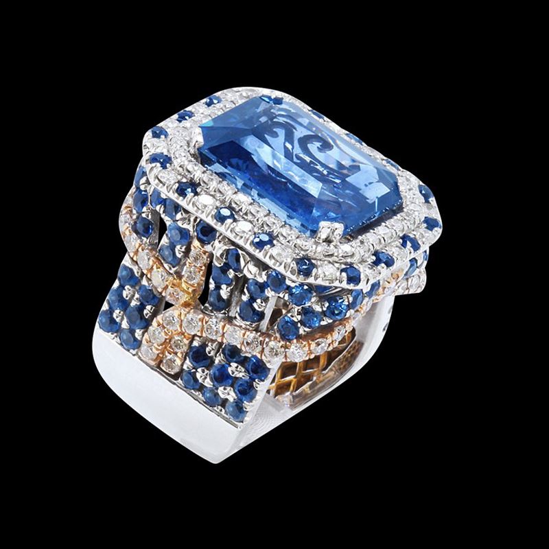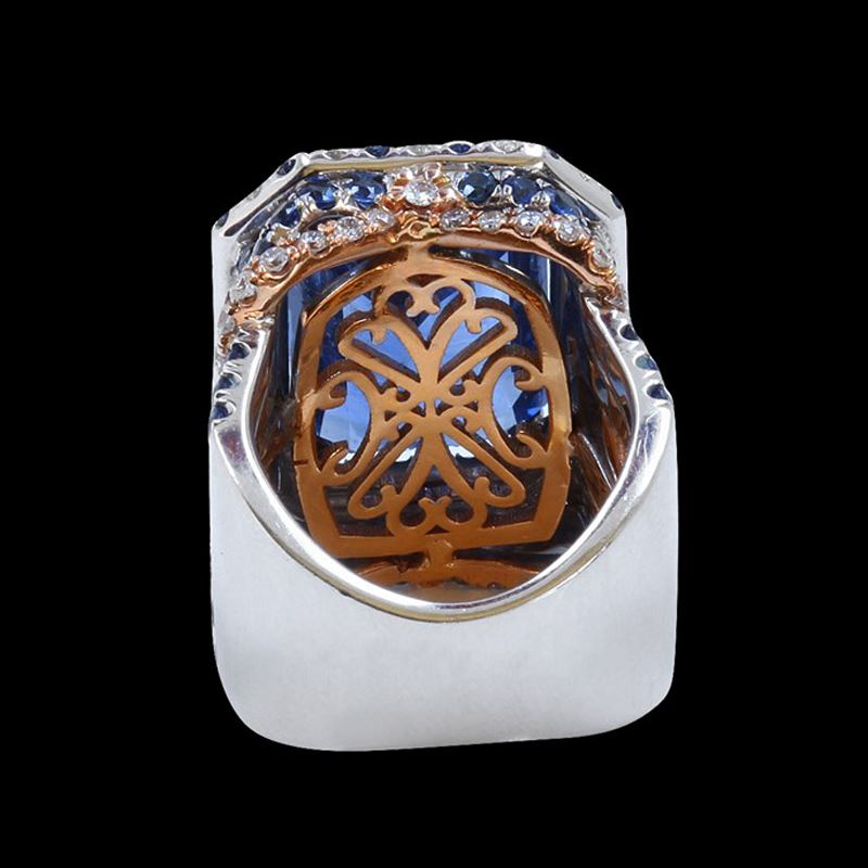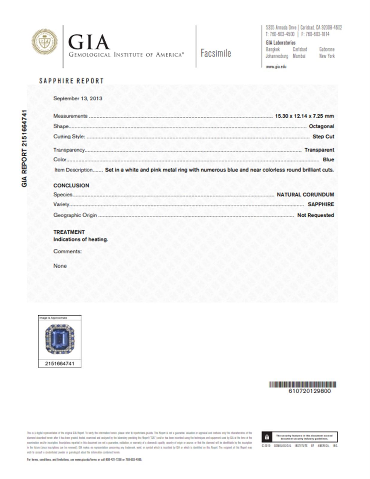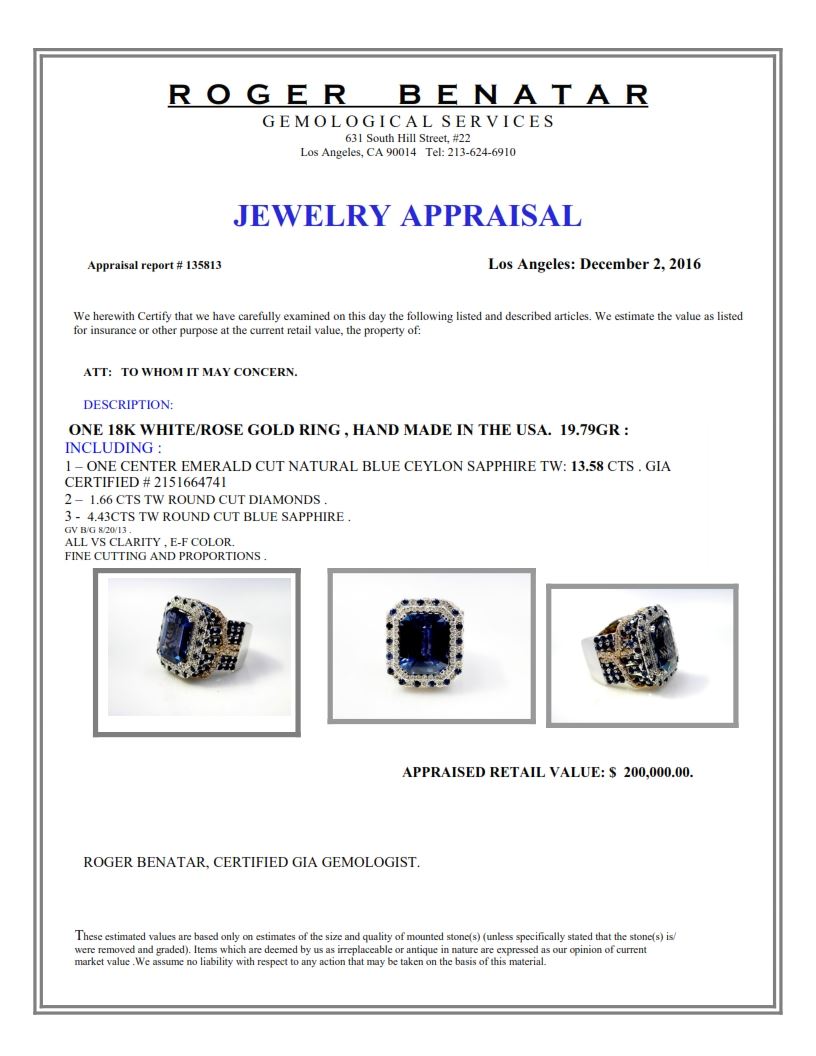 18K WHITE AND ROSE GOLD NATURAL CEYLON BLUE SAPPHIRE RING:9.79 GRAMS/DIAMOND:1.66CT/BLUE SAPPHIRE(MAINSTONE):13.58CT/BLUE SAPPHIRE(SIDESTONE):4.43CT/GIA #2151664741/#GVR1189 **This spectacular 13.58ct Emerald Cut Natural Blue Ceylon Sappphire casts a brilliance of depth and mystery. Blue Sapphires are known to stimulate psychic abilities and activate one's higher intelligence. Framed by a twinkling pattern of 1.66ct round cut Diamonds and 4.43ct Round Cut Blue Sapphire, added sparkle adorns its shank. Warmly crafted in 18K white and rose gold, it conjures images of royalty and grace. this gorgeous cocktail ring is an investment piece: a secure purchase ensuring long life.**