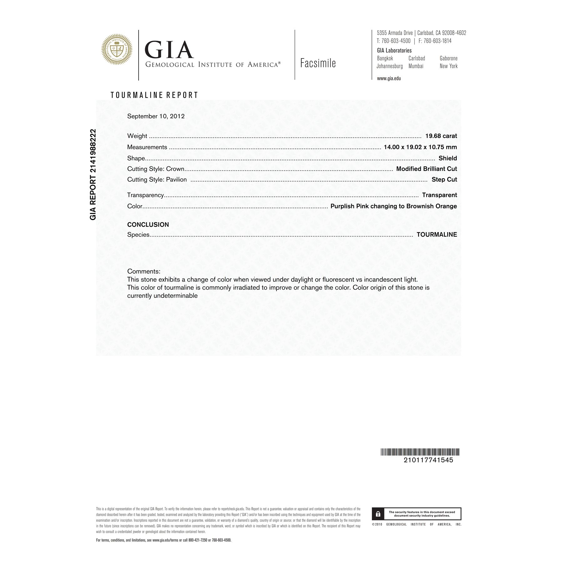 GIA 19.68ct Color Change Tourmaline Very Rare Stone GIA #2141988222 / color : Purplish Pink changing to Brownish Orange / This stone exhibits a change of color when viewed under daylight or fluorescent vs incandescent light. This color of tourmaline is commonly irradiated to improve or change the color.