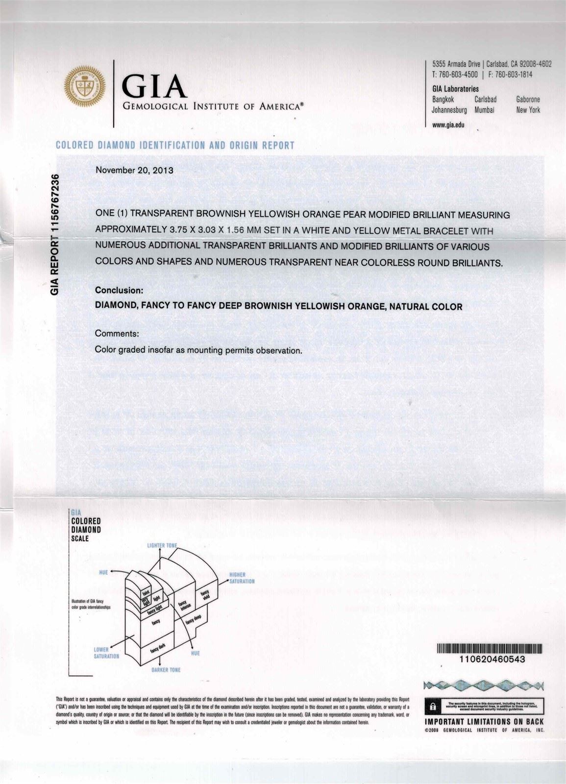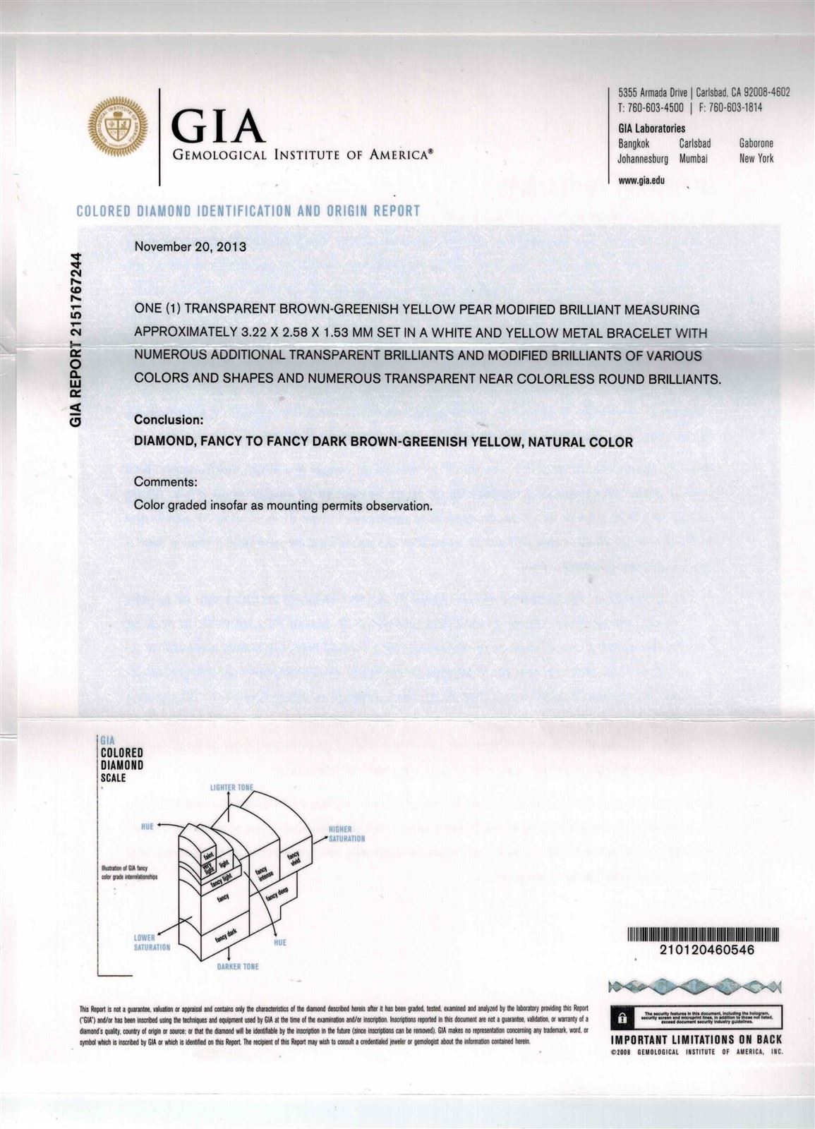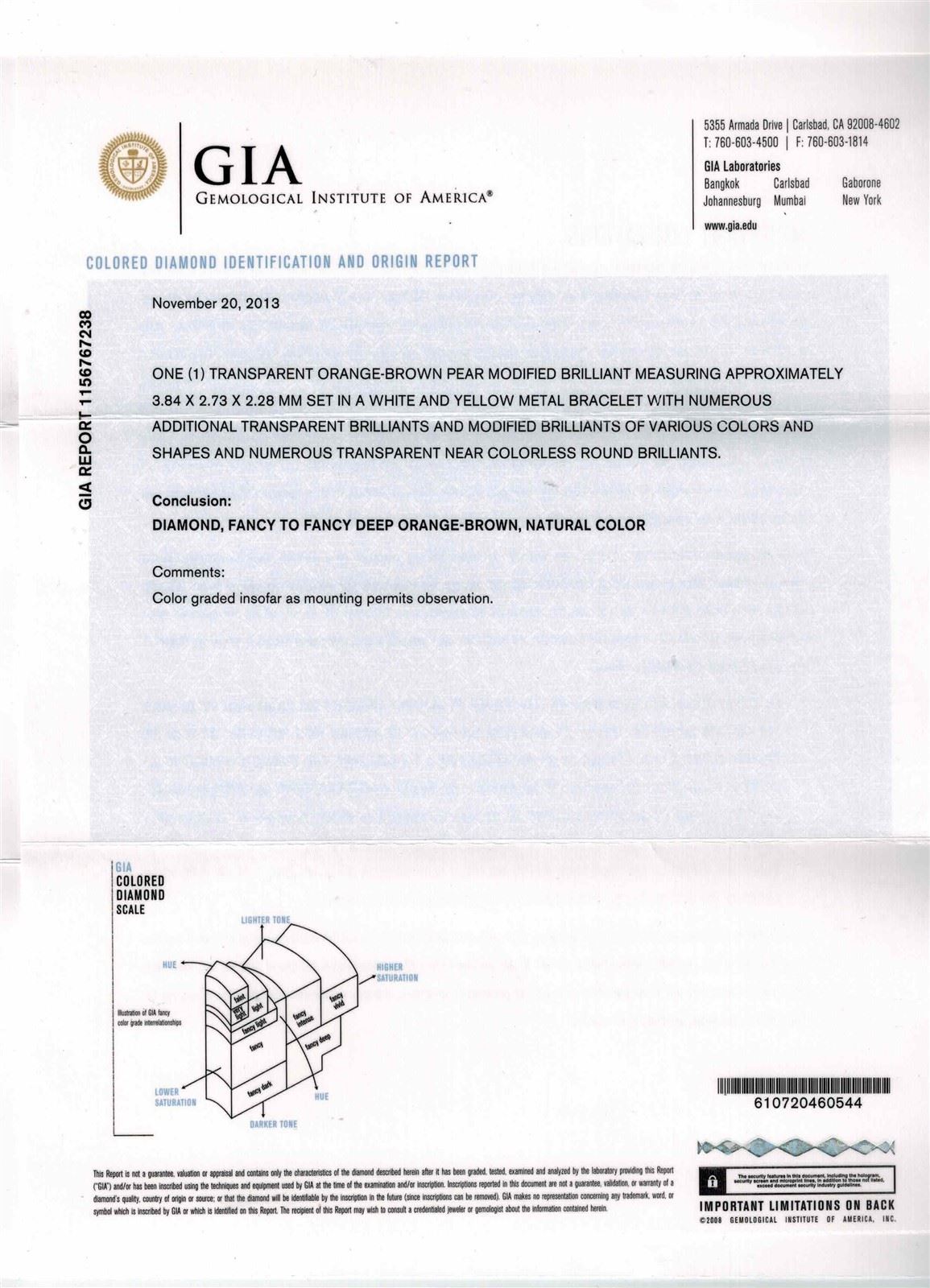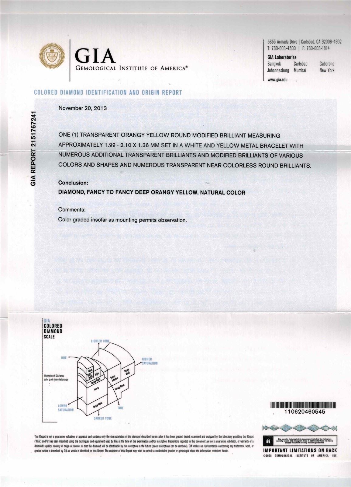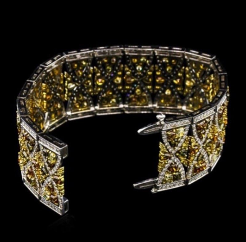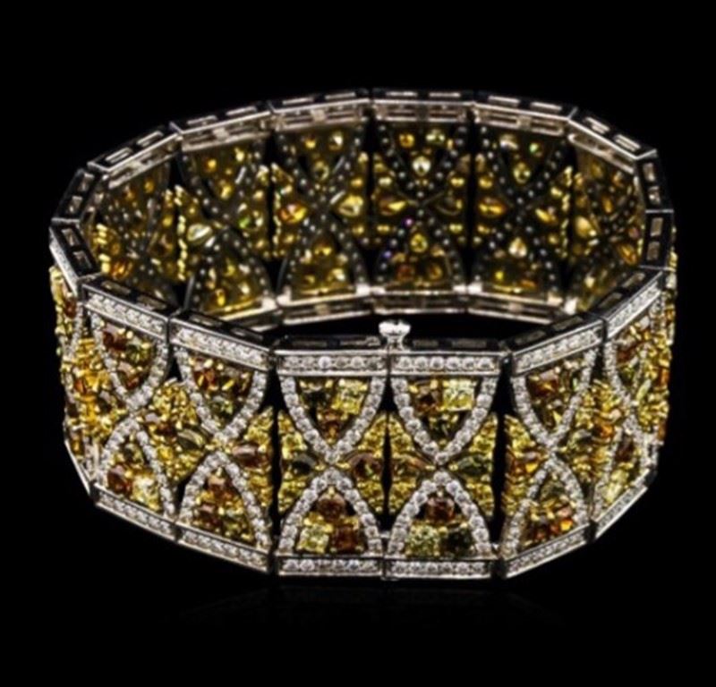 18K WHITE GOLD NATURAL DIAMOND BRACELET :47.45 GRAMS/MIX SHAPE (Yellow, Brown & Red) DIAMOND:21.03CT/WHITE DIAMOND:6.36CT/#GVB1198 ** 18KT White and Yellow gold handcrafted bracelet weighing 47.45 grams containing: natural fancy color mixed shape diamonds with a total weight of 21.03ct and natural round brilliant cut diamonds with a total weight of 6.36ct (VS clarity; E color). Mix of French classical design with geometric layering combined with two tone flourishes beneath. Contacts intircate and beautiful arrangement of mix-shaped Natural White and Yellow Diamonds. Natural White Diamonds are of E-F color and VS clarity. 5 GIA Certificates regarding the Natural Colored Diamonds, all VS quality and varying sizes and colors. Bracelet setting is crafted with extreme precision and detail, sitting like silk on the wrist.